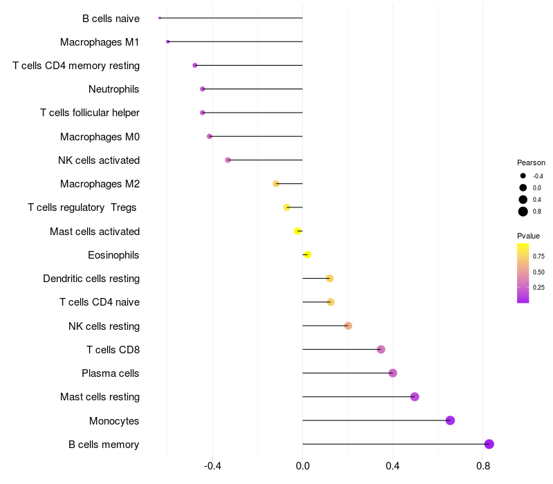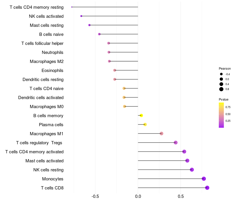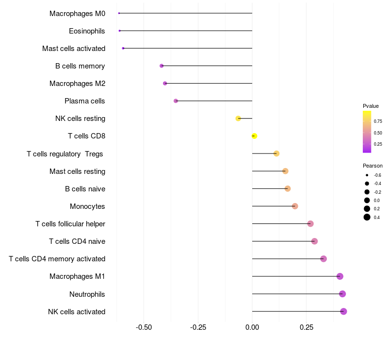 Lollipop of RBM33 expression and immune infiltrating cell level correlation result in HBV+ Liver cirrhosis samples