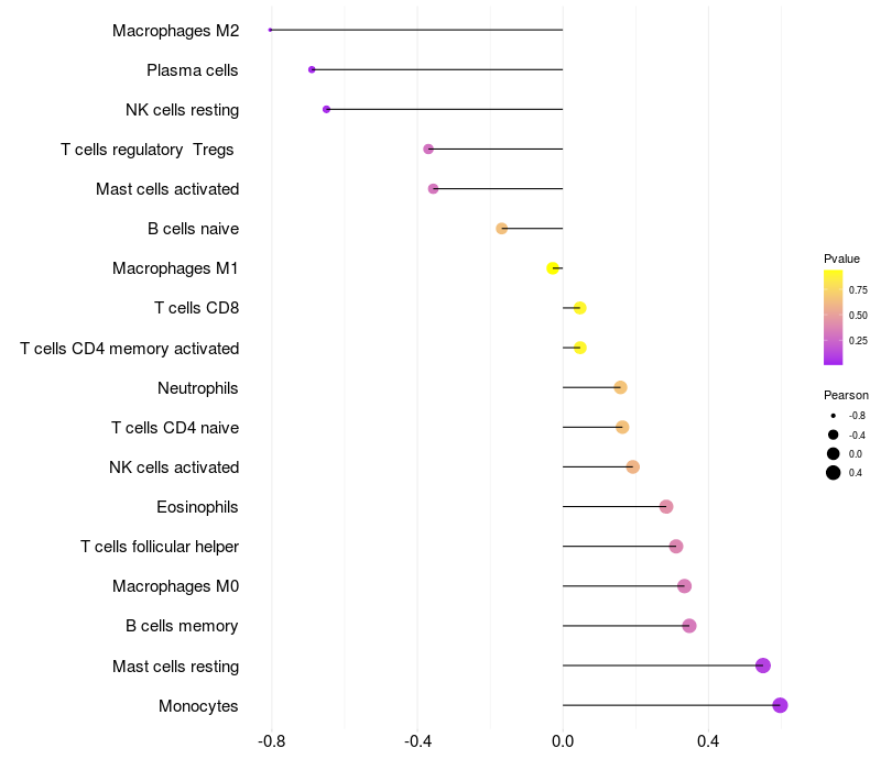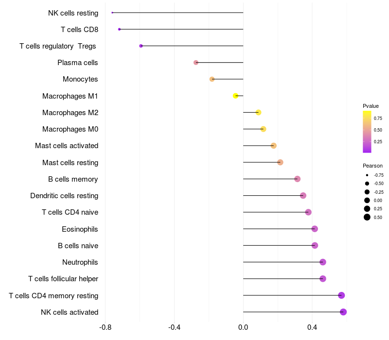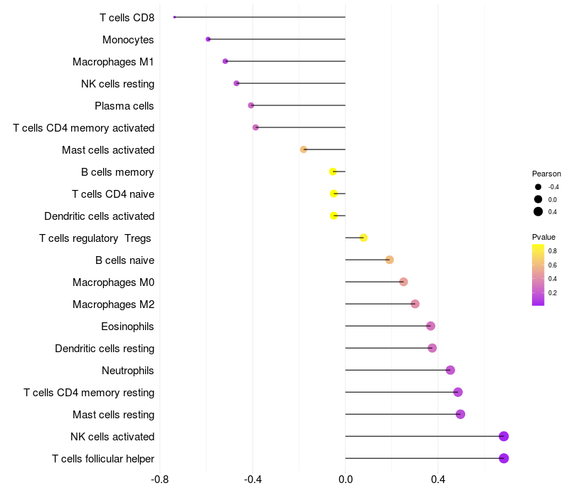 Lollipop of RBM34 expression and immune infiltrating cell level correlation result in HBV+ Liver cirrhosis samples