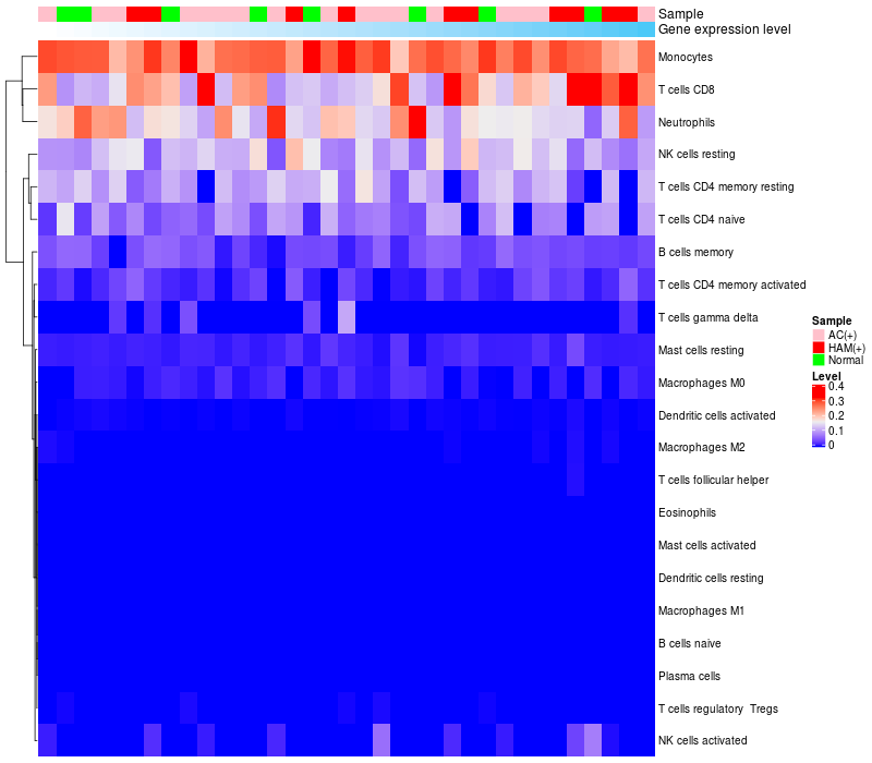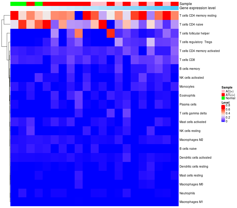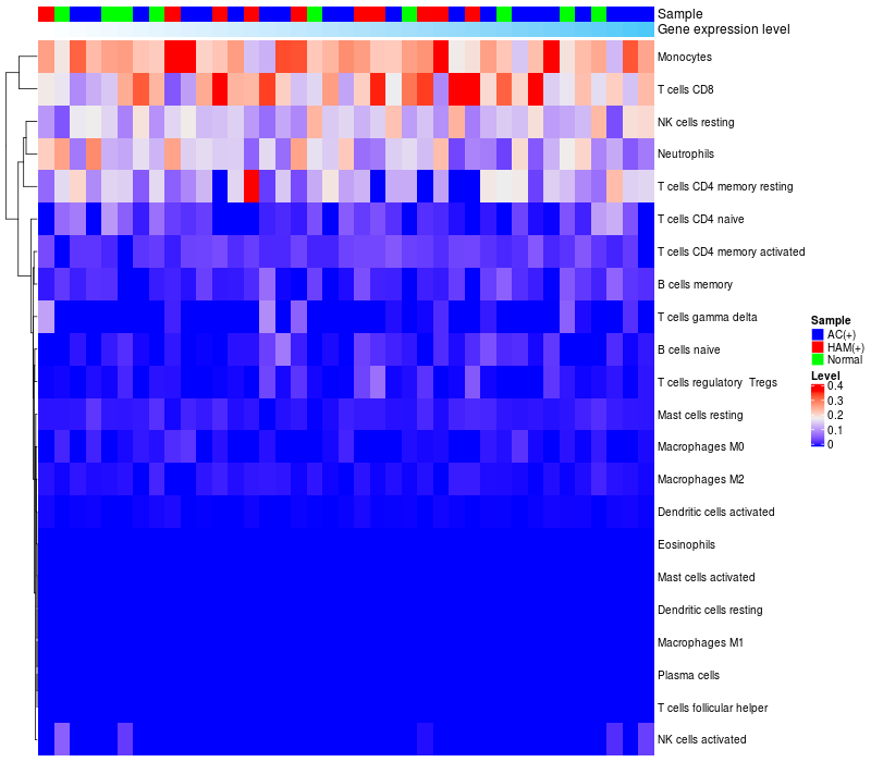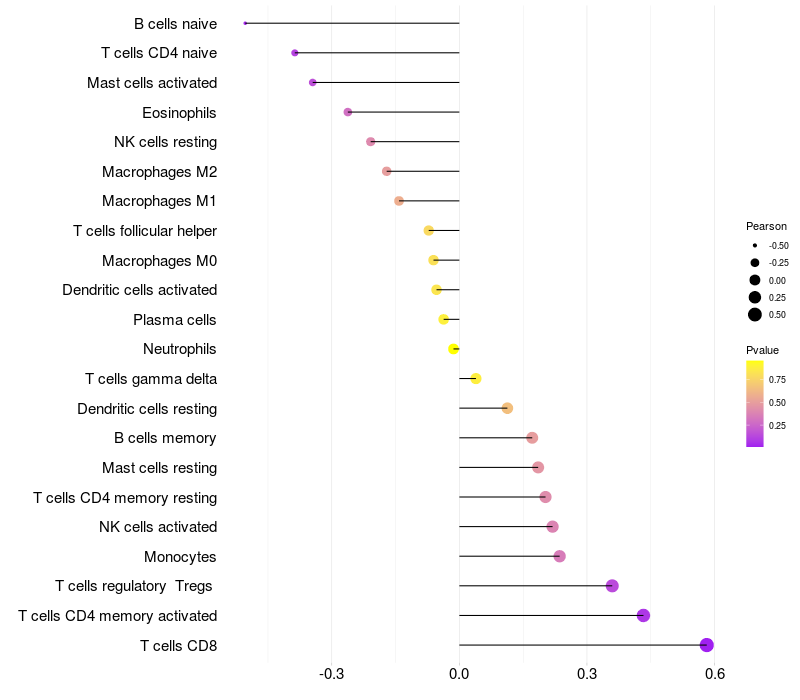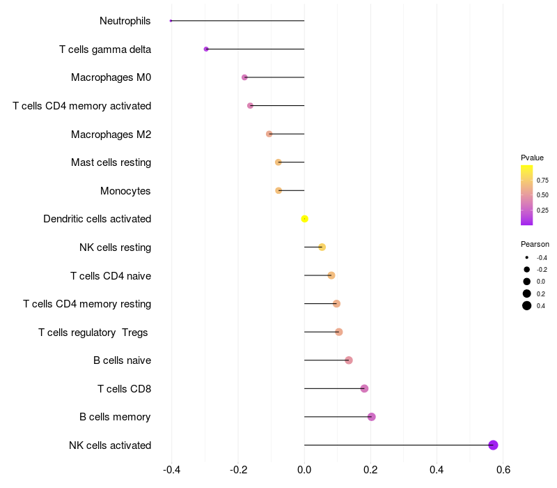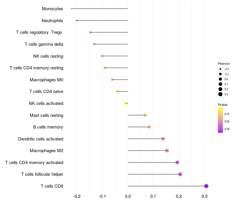 Lollipop of RCBTB1 expression and immune infiltrating cell level correlation result in HTLV1+ samples