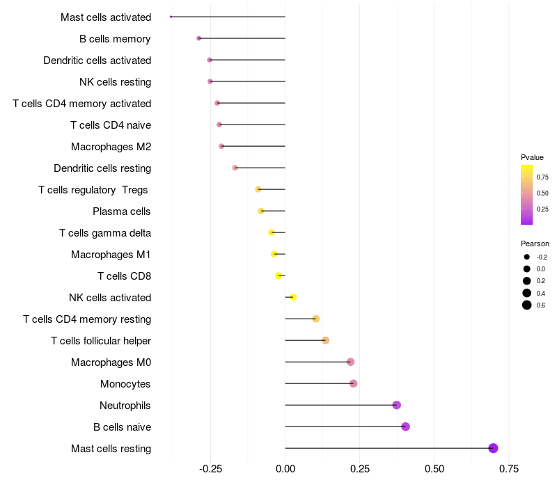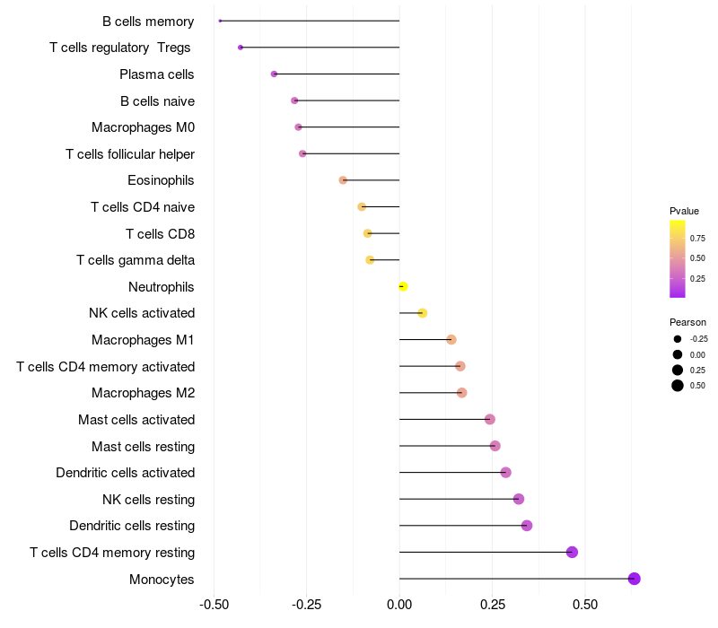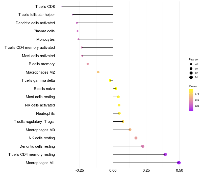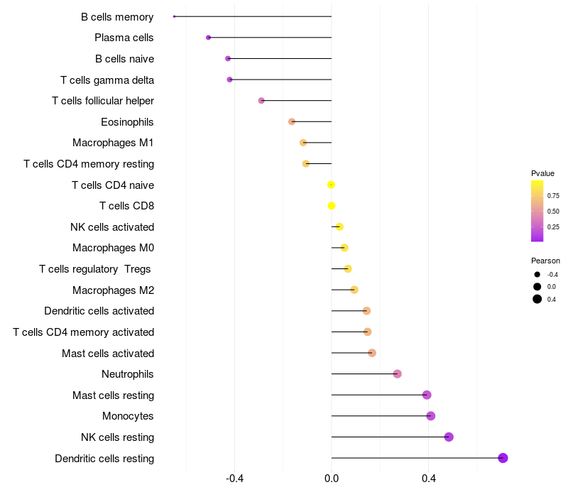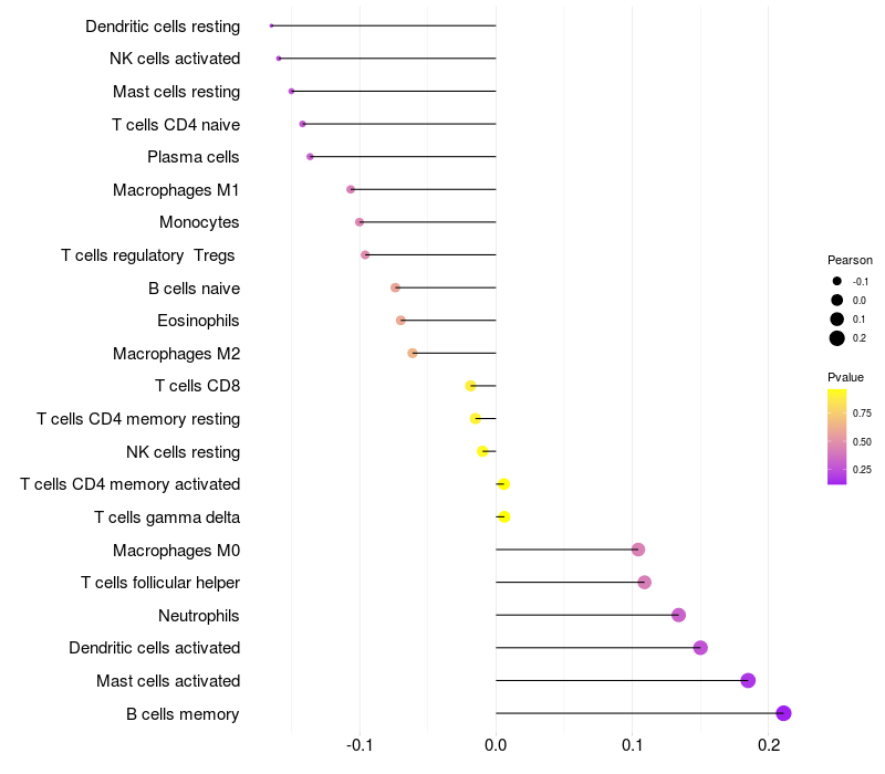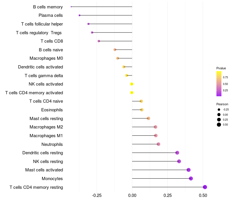 Lollipop of RDH16 expression and immune infiltrating cell level correlation result in HPV+ samples