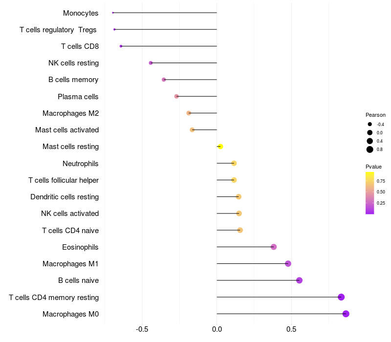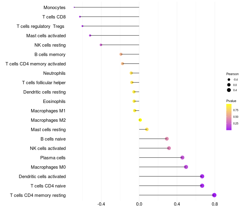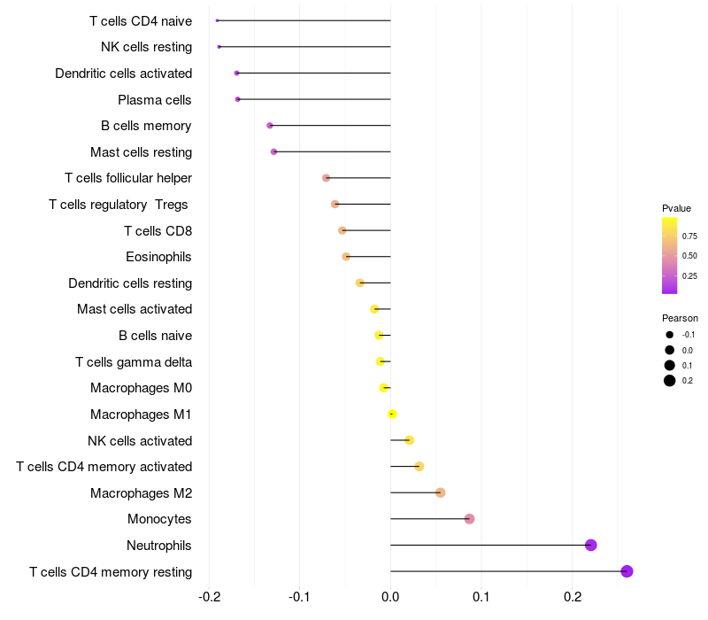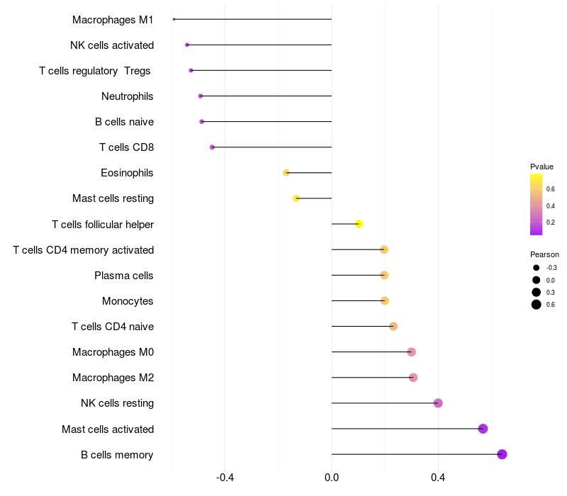 Lollipop of RECK expression and immune infiltrating cell level correlation result in HBV+ Liver cirrhosis samples
