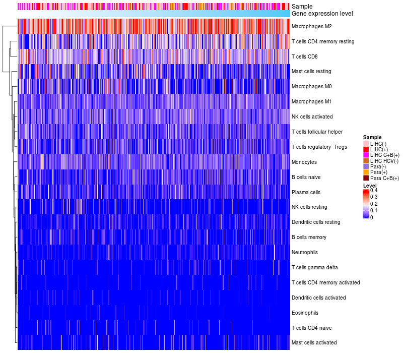 Liver hepatocellular carcinoma HCV (HBV+)(86), Liver hepatocellular carcinoma HCV (HBV-)(19), Liver hepatocellular carcinoma (HBV+)(209), Liver hepatocellular carcinoma (HBV+)(60), Paracancerous HCV (HBV+)(4), Paracancerous (HBV-)(28), Paracancerous (HBV+)(18) |