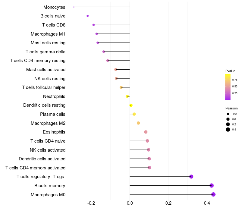 Lollipop of RELB expression and immune infiltrating cell level correlation result in HBV+ samples