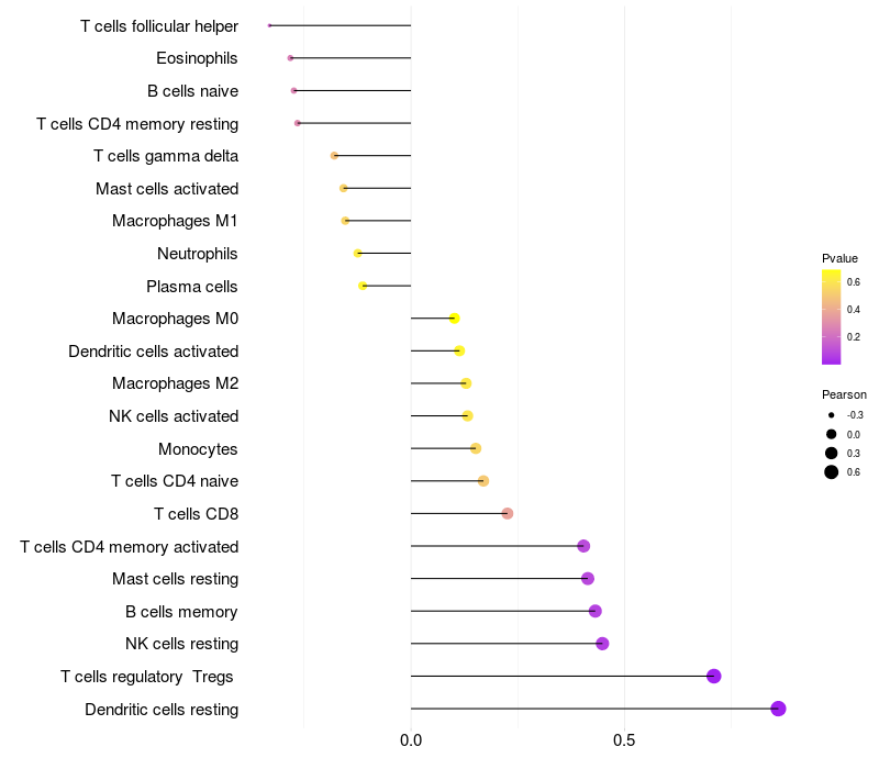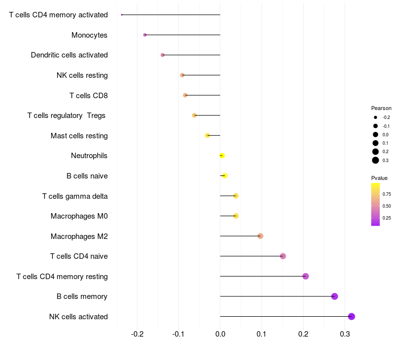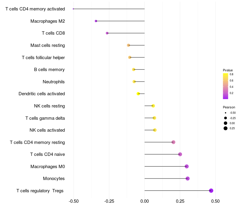 Lollipop of REN expression and immune infiltrating cell level correlation result in HTLV1+ samples