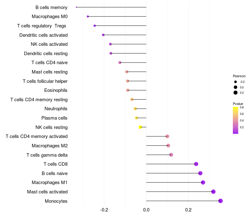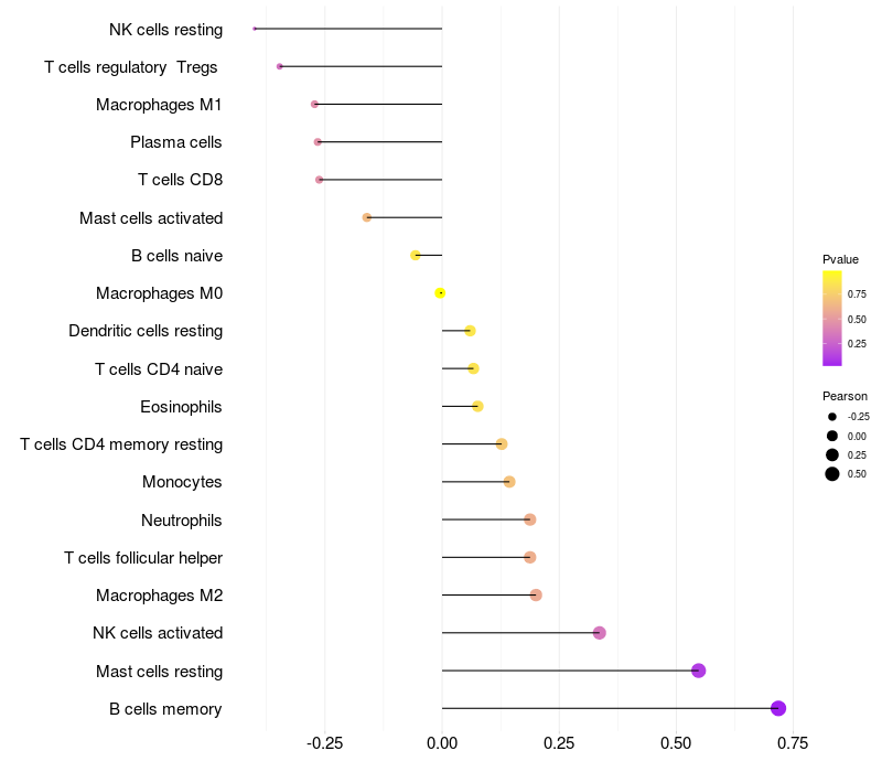 Lollipop of REPS1 expression and immune infiltrating cell level correlation result in HBV+ Liver cirrhosis samples