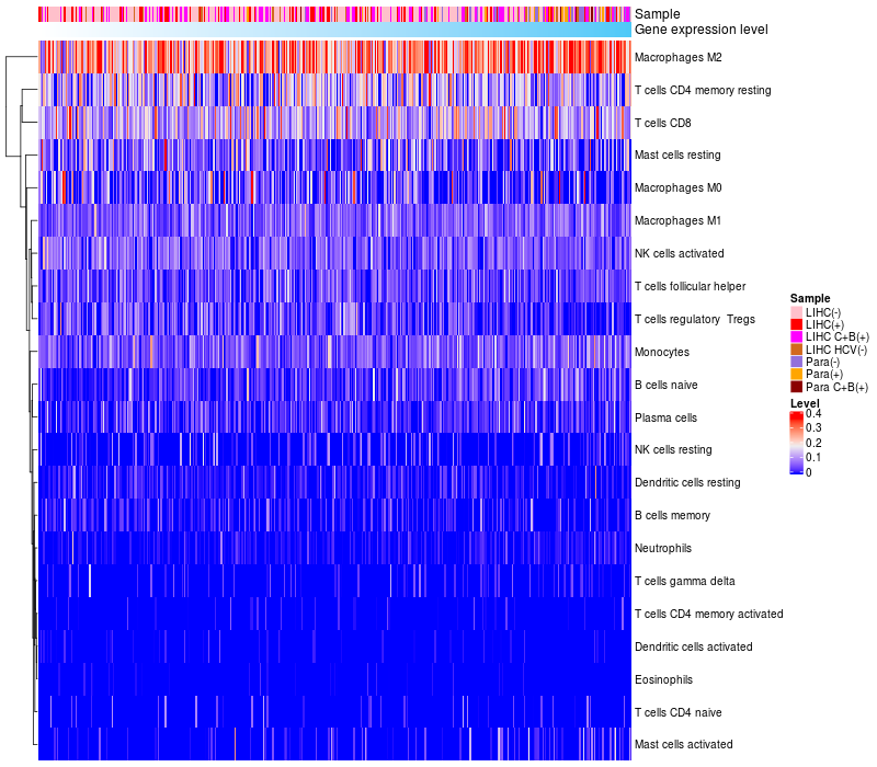 Liver hepatocellular carcinoma HCV (HBV+)(86), Liver hepatocellular carcinoma HCV (HBV-)(19), Liver hepatocellular carcinoma (HBV+)(209), Liver hepatocellular carcinoma (HBV+)(60), Paracancerous HCV (HBV+)(4), Paracancerous (HBV-)(28), Paracancerous (HBV+)(18) |