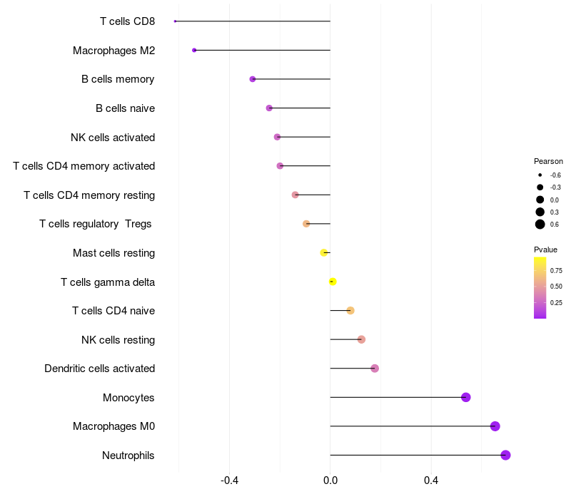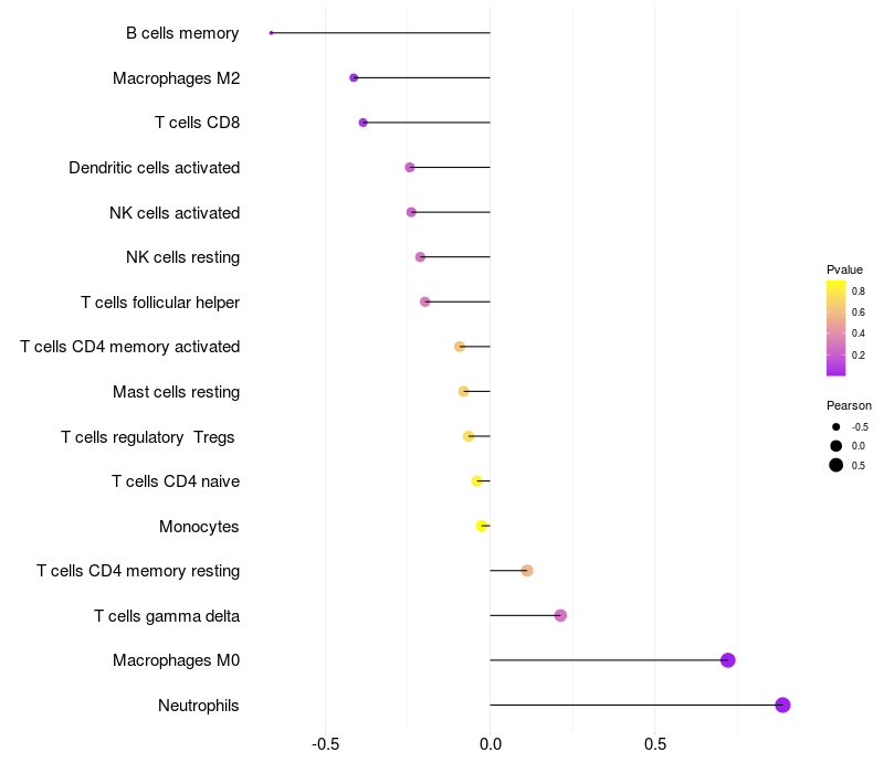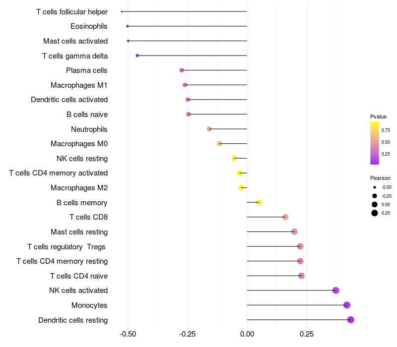 Lollipop of REPS2 expression and immune infiltrating cell level correlation result in HTLV1+ samples