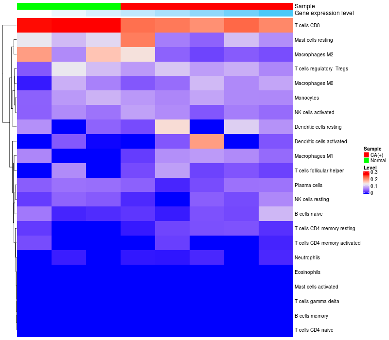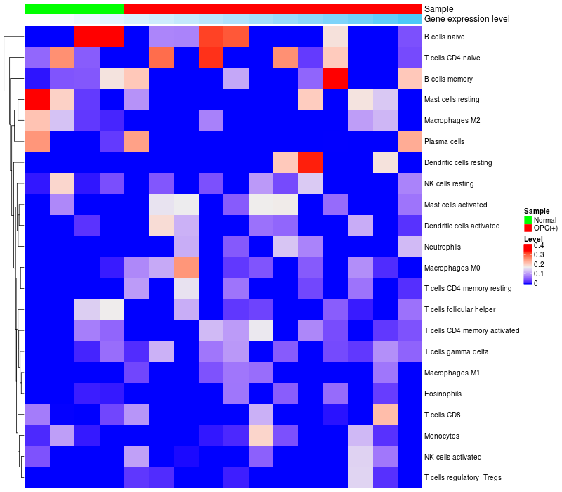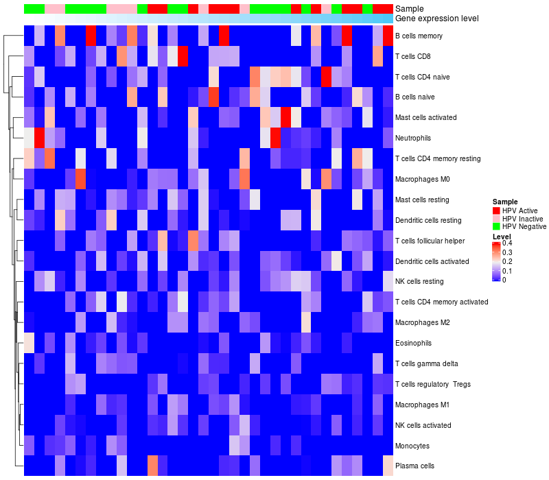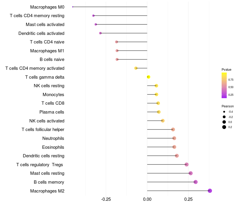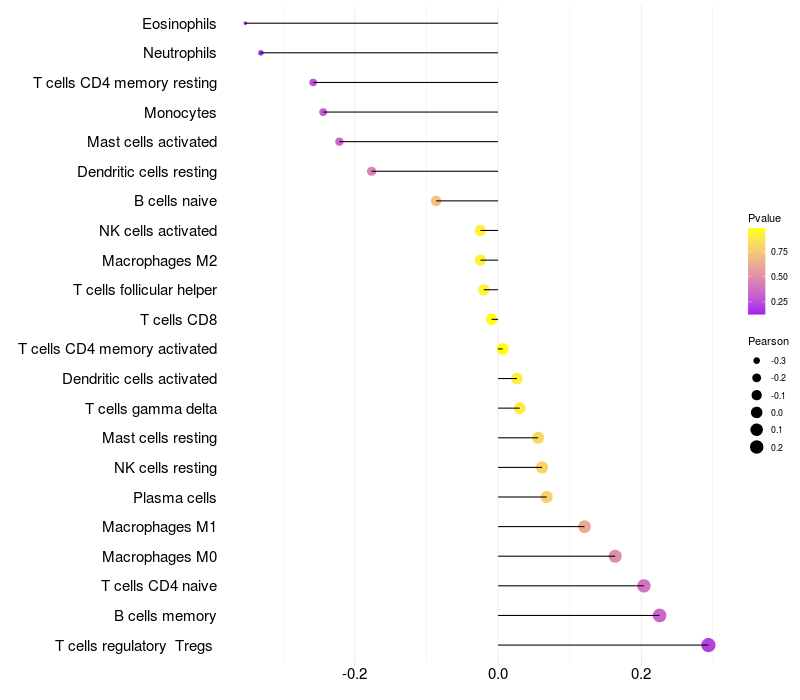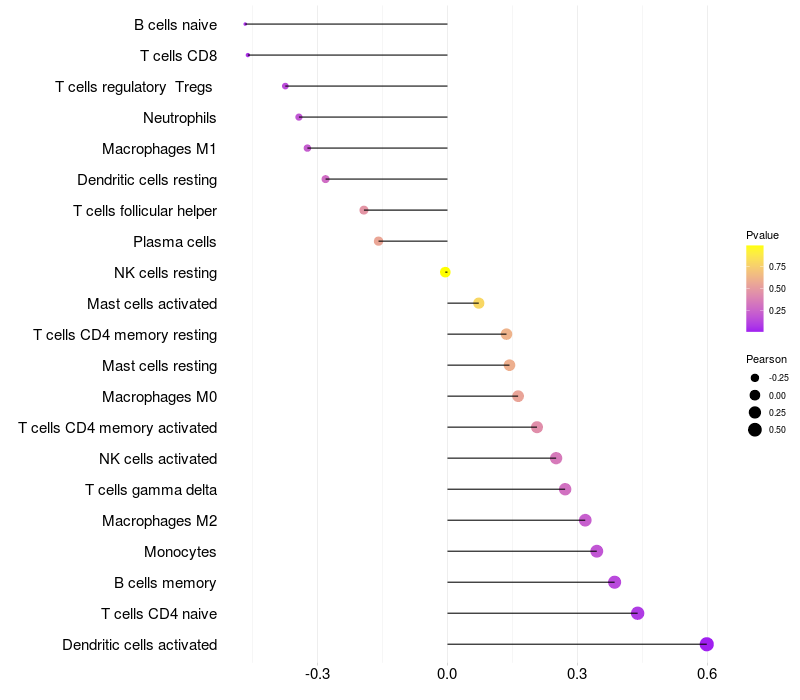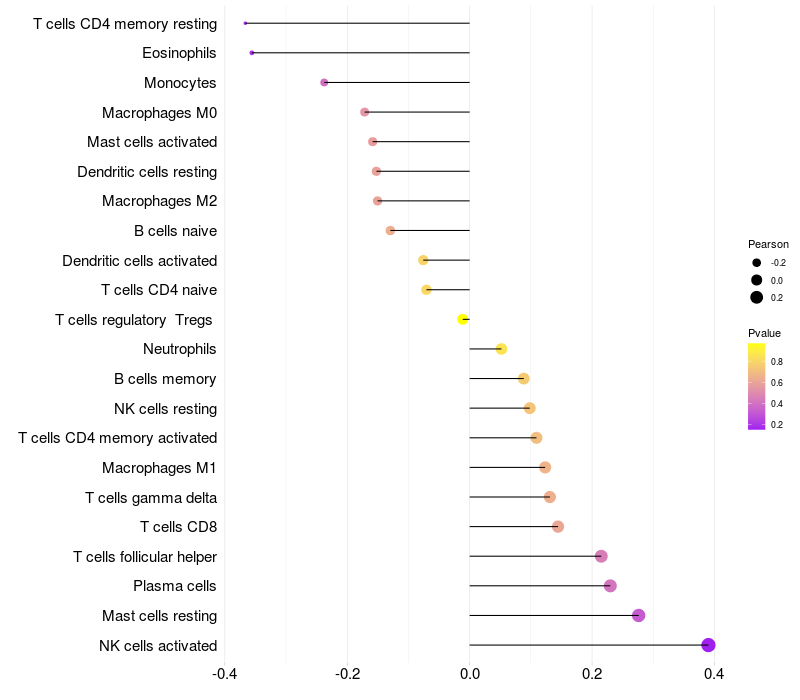 Lollipop of RFC4 expression and immune infiltrating cell level correlation result in HPV+ samples