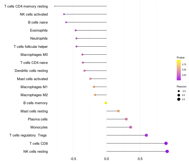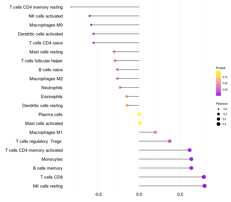 Lollipop of RFPL1 expression and immune infiltrating cell level correlation result in HBV+ Chronic HBV (CHB) infection samples