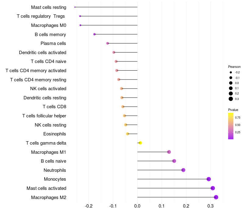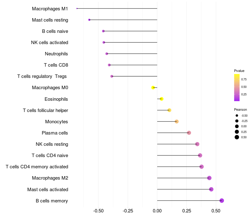 Lollipop of RFPL1 expression and immune infiltrating cell level correlation result in HBV+ Liver cirrhosis samples