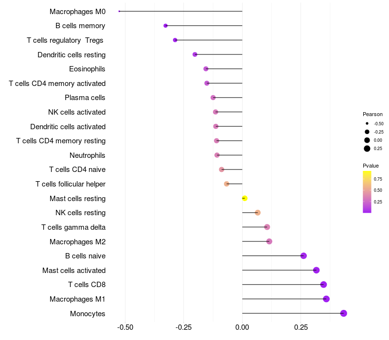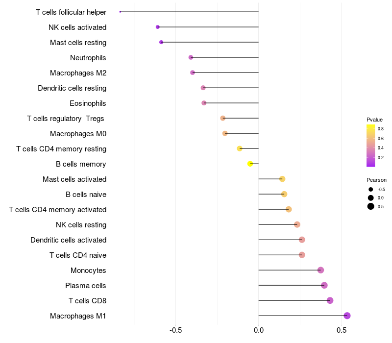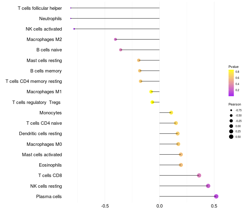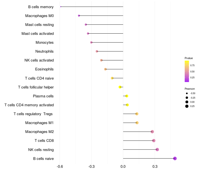 Lollipop of RGN expression and immune infiltrating cell level correlation result in HBV+ Liver cirrhosis samples