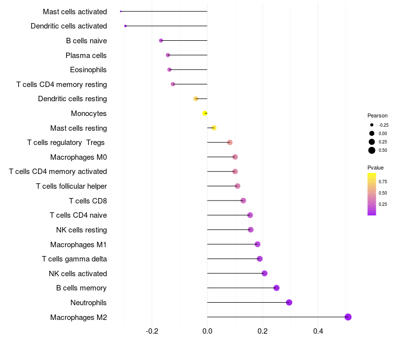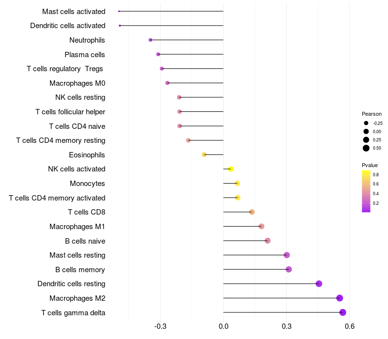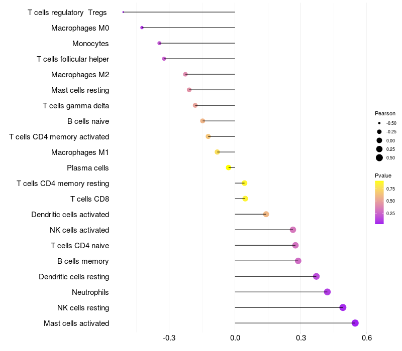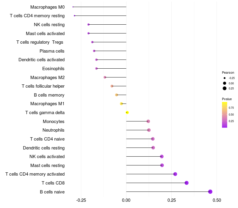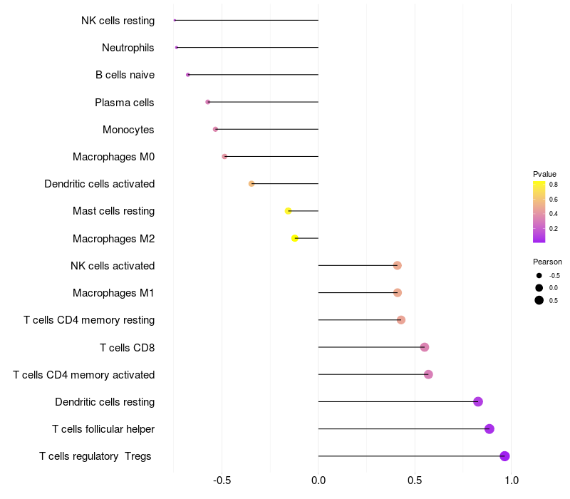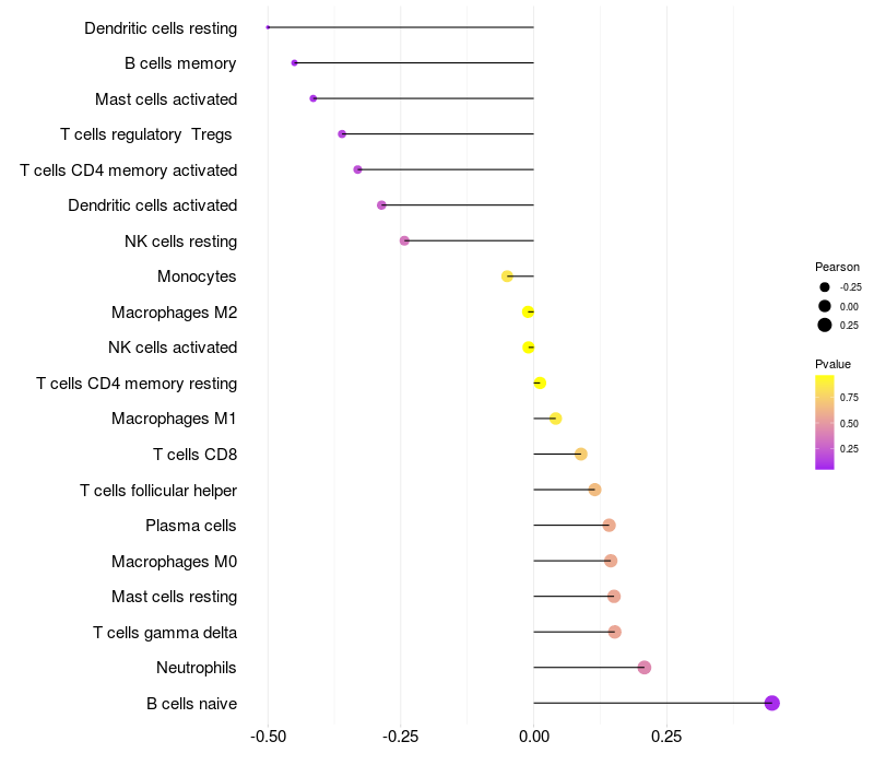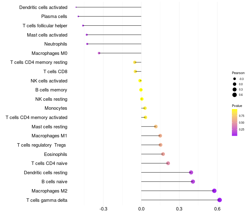 Lollipop of RGS18 expression and immune infiltrating cell level correlation result in HPV+ samples