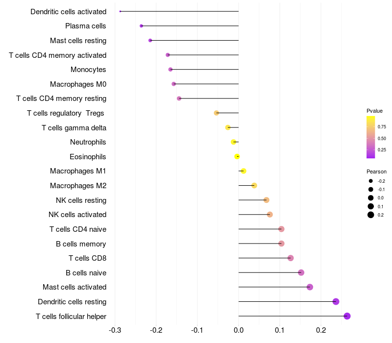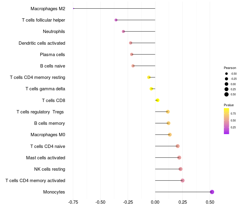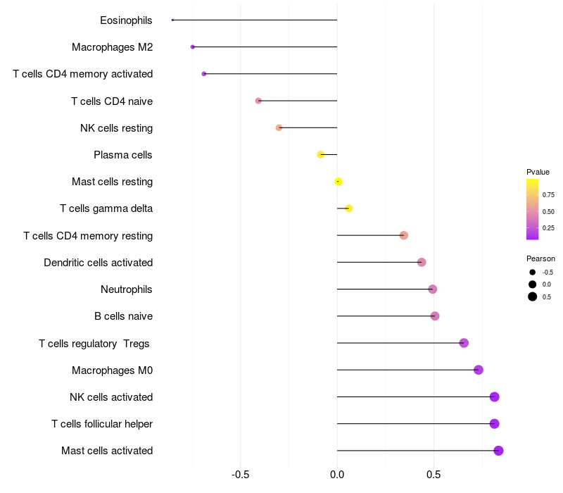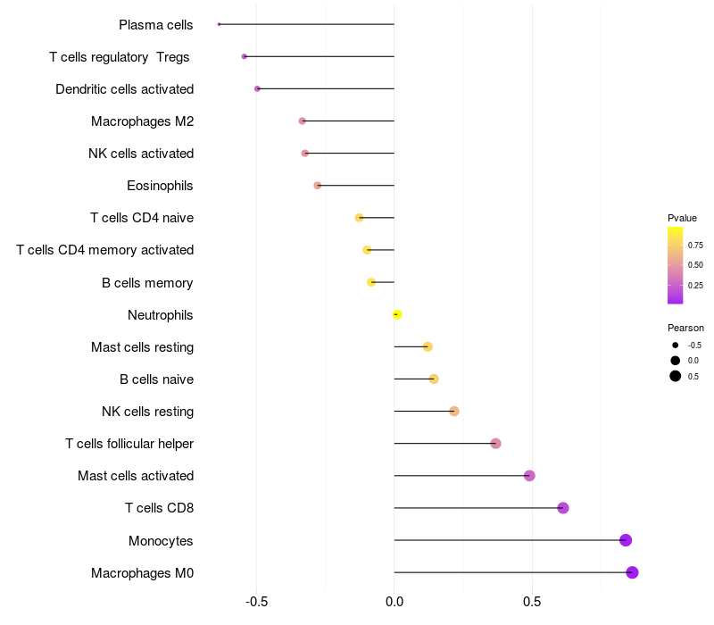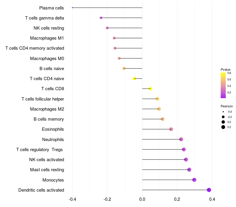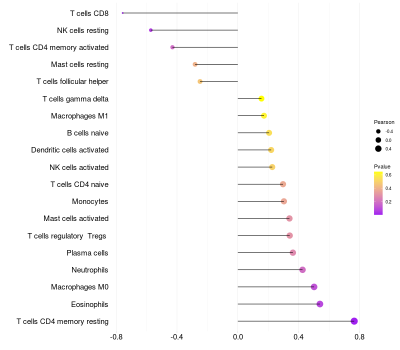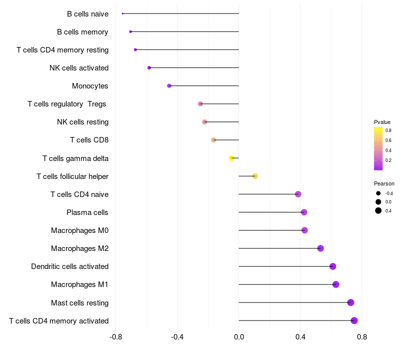 Lollipop of RGS6 expression and immune infiltrating cell level correlation result in EBV+ samples
