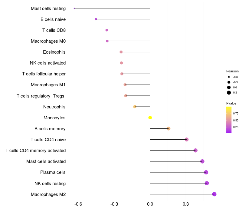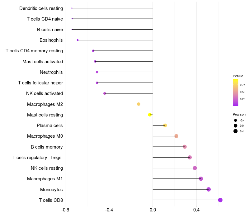 Lollipop of RGS7 expression and immune infiltrating cell level correlation result in HBV+ Liver cirrhosis samples