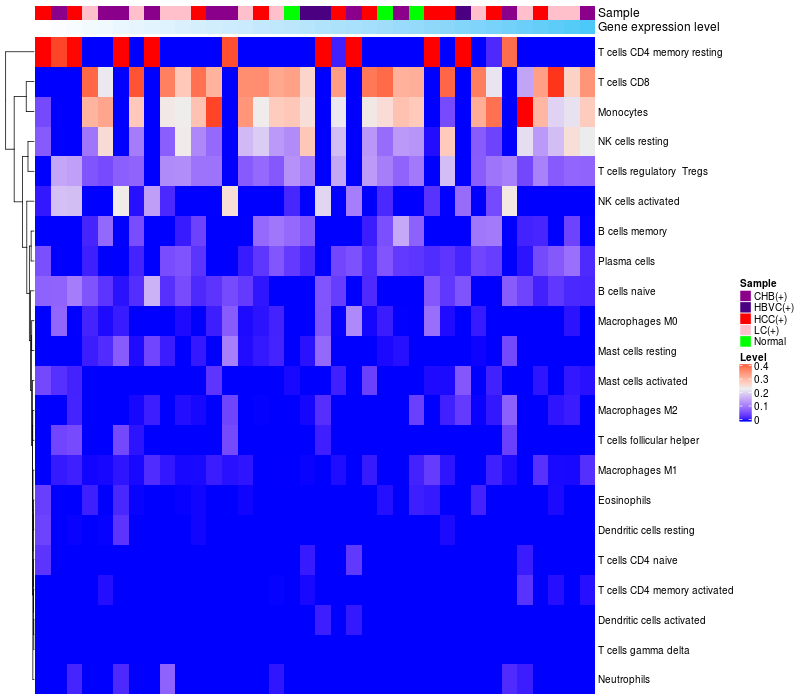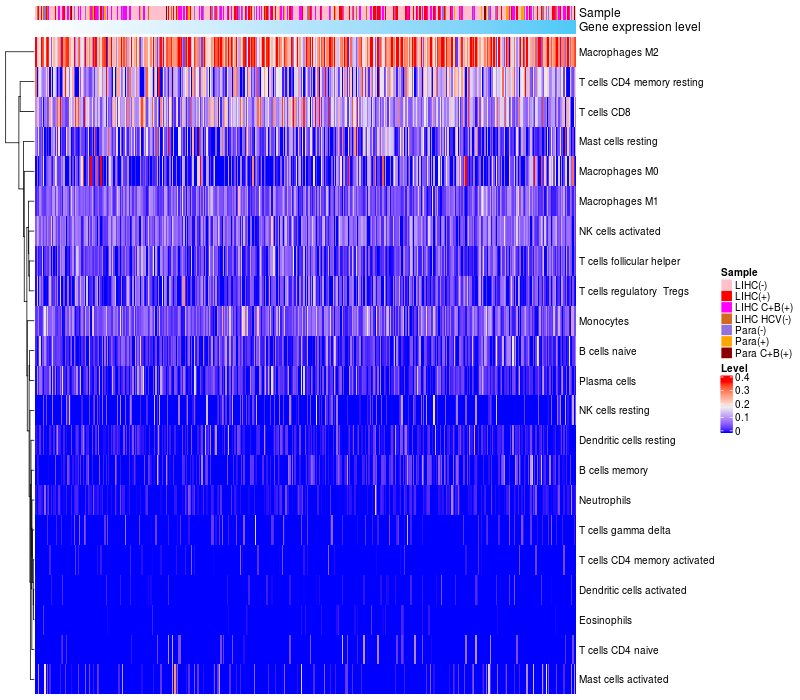 Liver hepatocellular carcinoma HCV (HBV+)(86), Liver hepatocellular carcinoma HCV (HBV-)(19), Liver hepatocellular carcinoma (HBV+)(209), Liver hepatocellular carcinoma (HBV+)(60), Paracancerous HCV (HBV+)(4), Paracancerous (HBV-)(28), Paracancerous (HBV+)(18) |