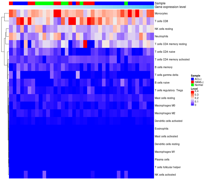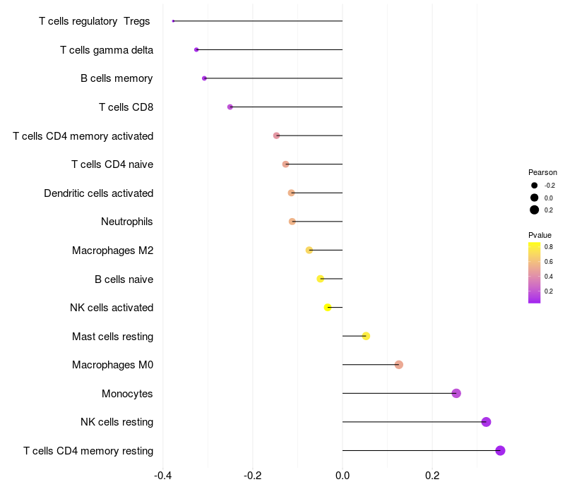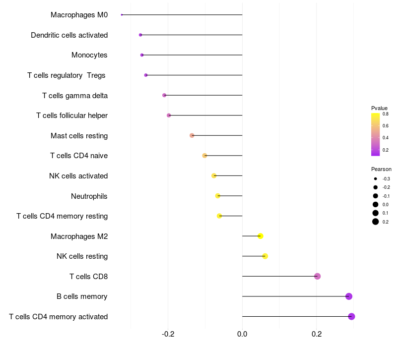 Lollipop of RHBDL3 expression and immune infiltrating cell level correlation result in HTLV1+ samples