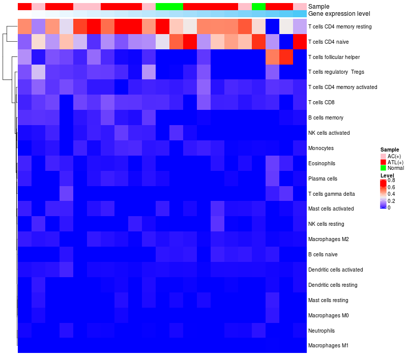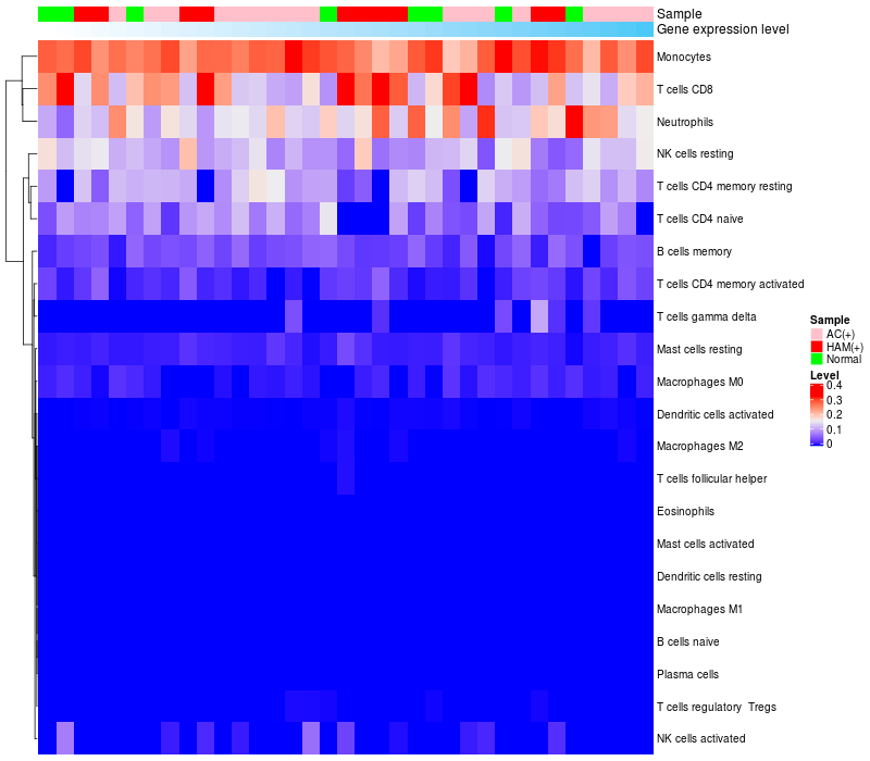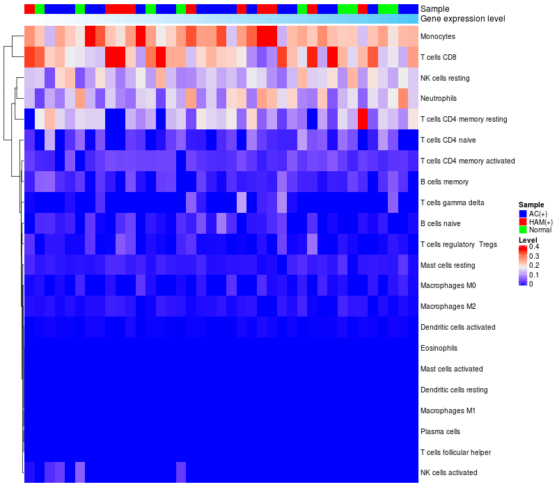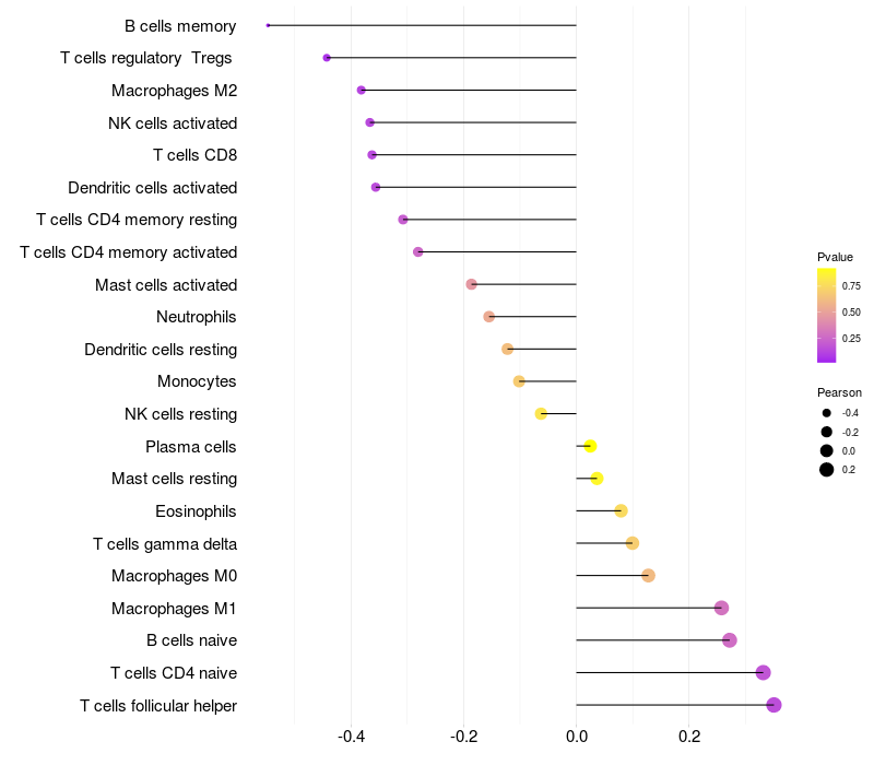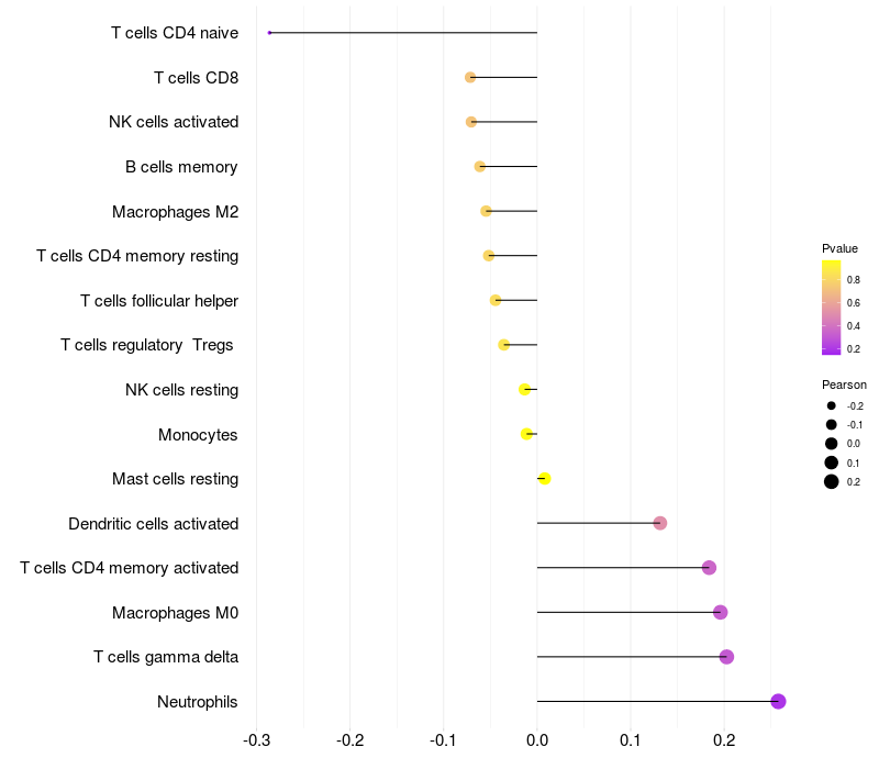 Lollipop of RHCG expression and immune infiltrating cell level correlation result in HTLV1+ samples