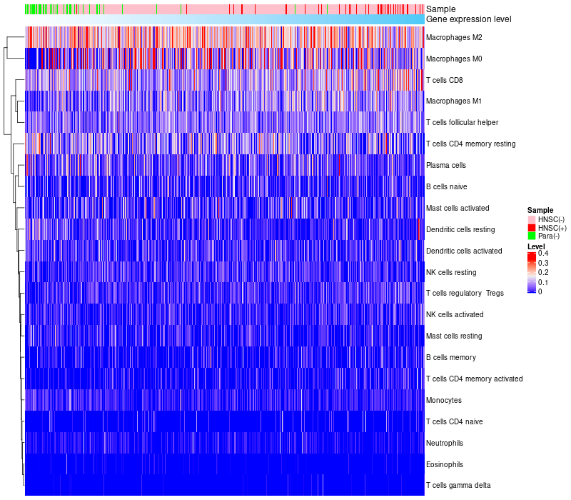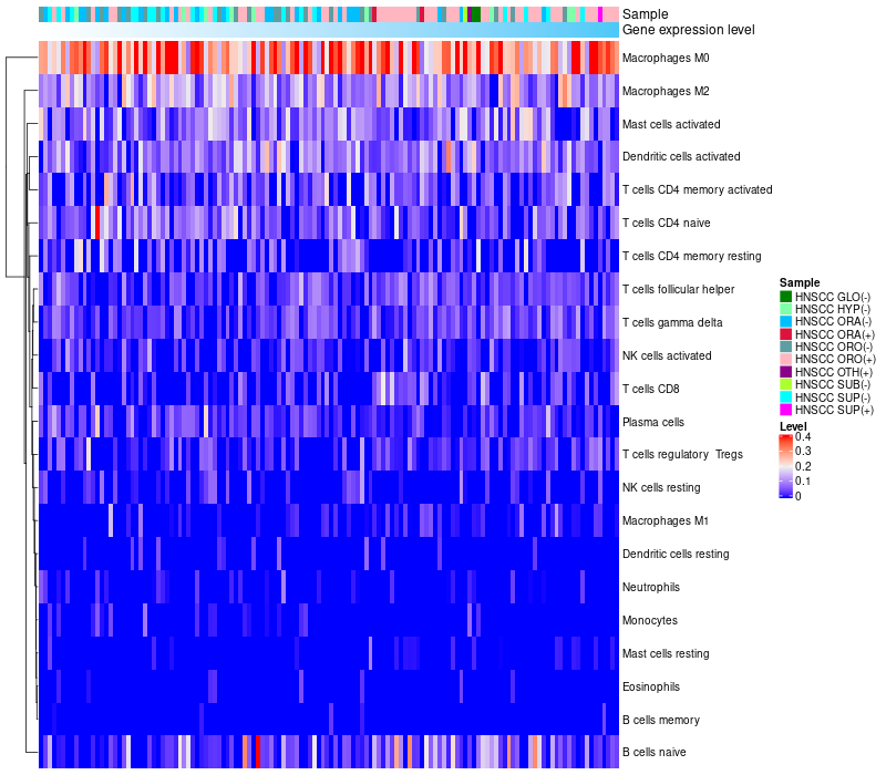 • Left: Heatmap of target gene expression and the level of various types of immune cells (cell type fractions) in all samples based on CIBERSORT method.