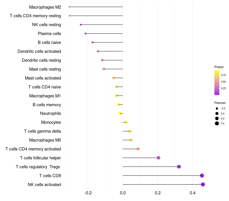 • Right: Correlation of target gene expression and the level of various types of immune cells in virus positive samples (Pearson Correlation Coefficient).