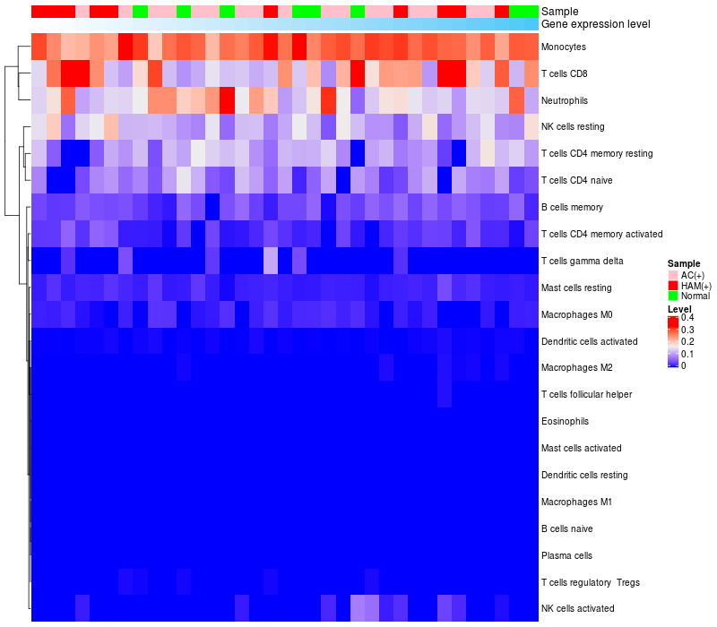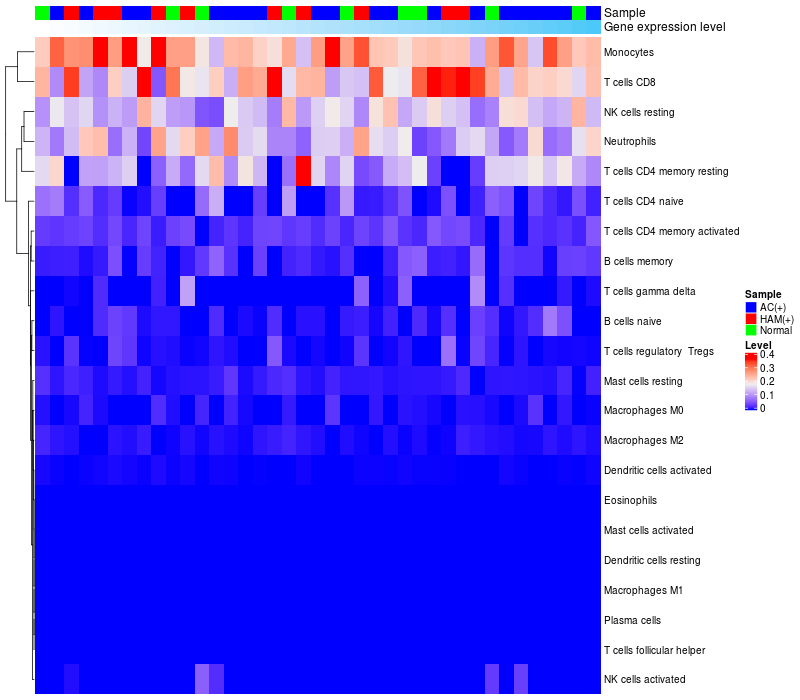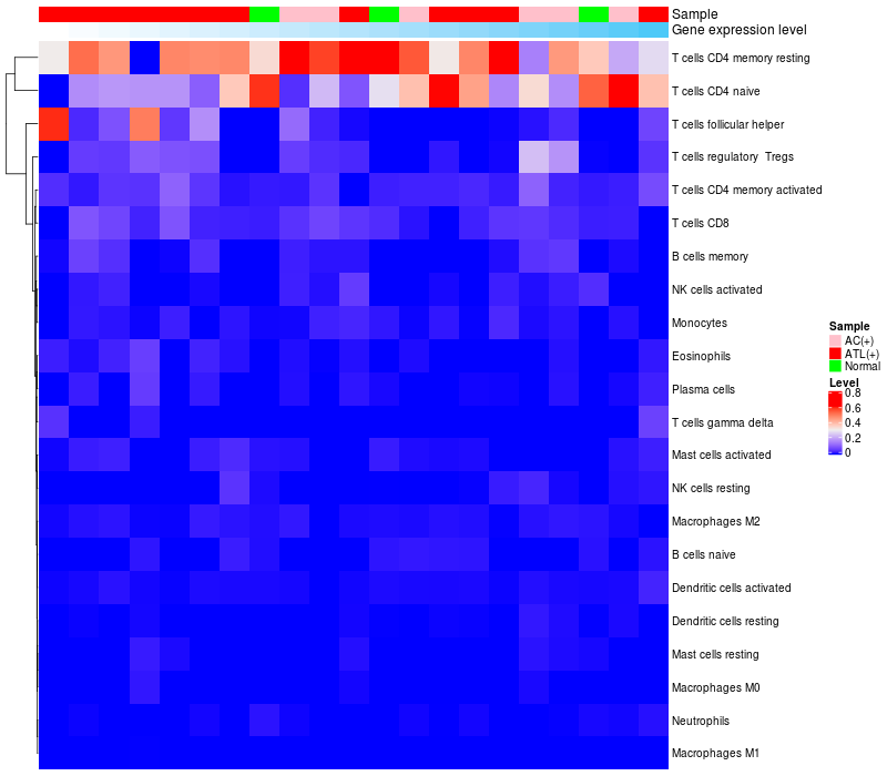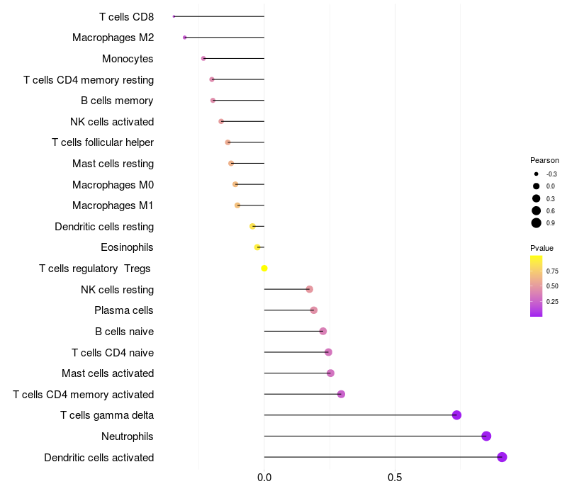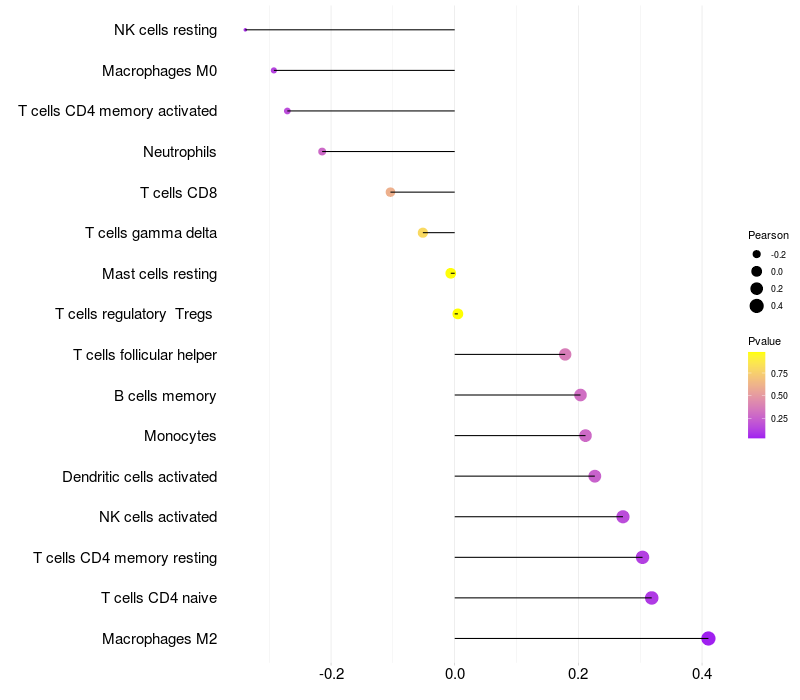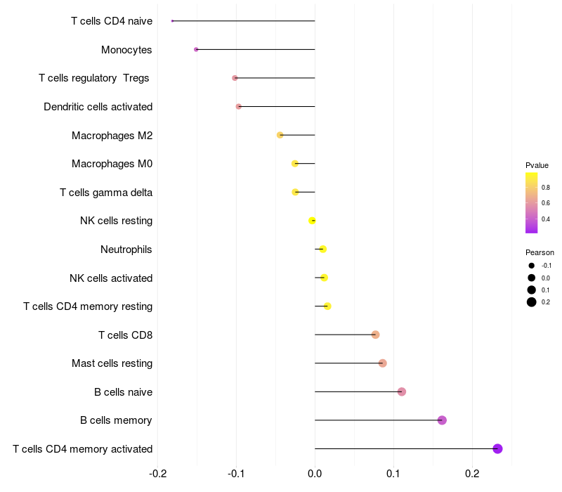 Lollipop of RHOBTB2 expression and immune infiltrating cell level correlation result in HTLV1+ samples