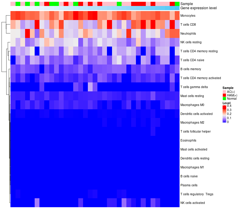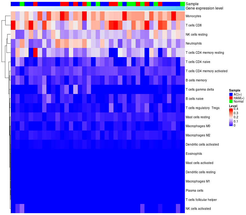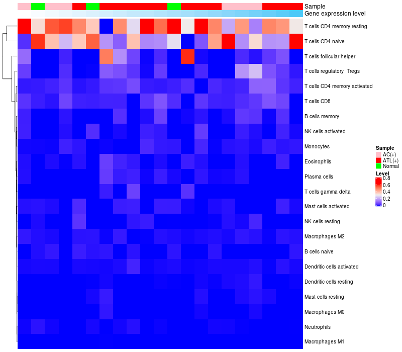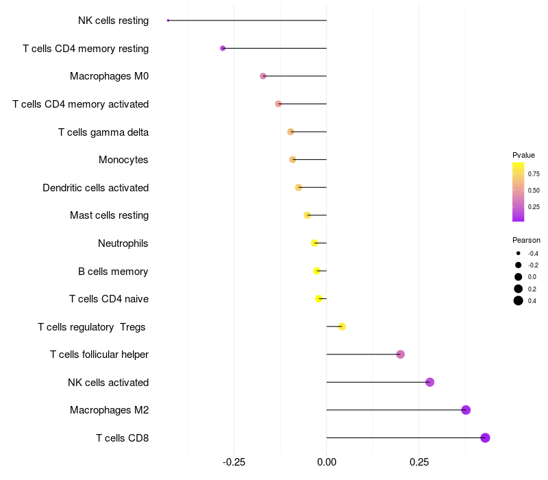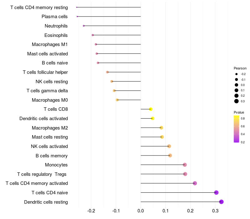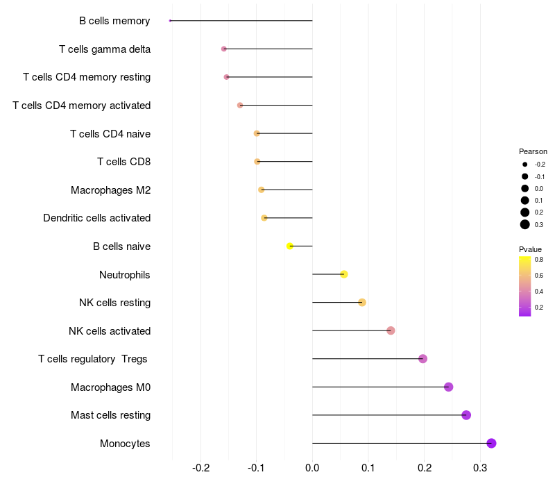 Lollipop of RIBC2 expression and immune infiltrating cell level correlation result in HTLV1+ samples