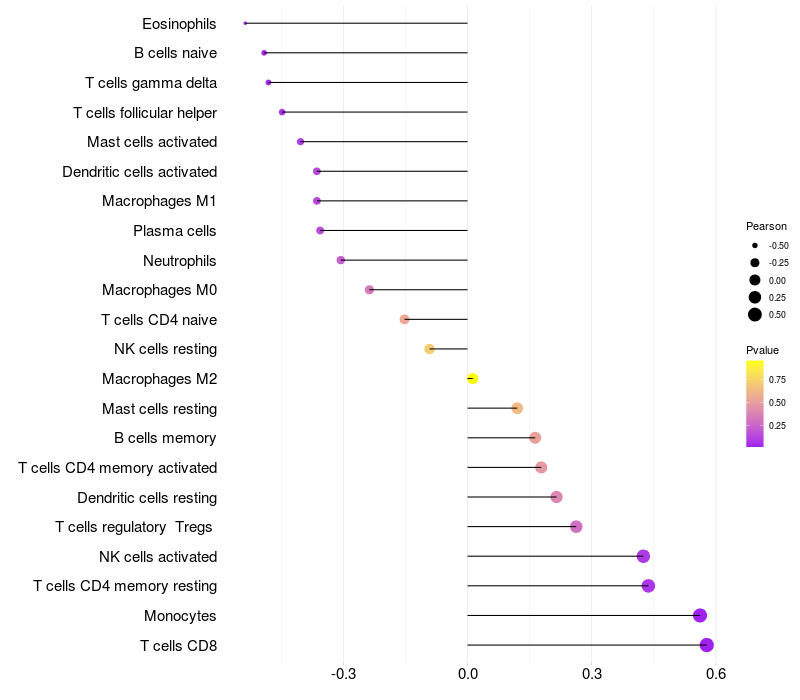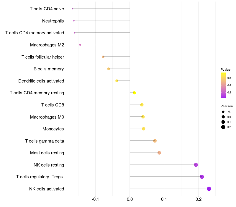 Lollipop of RIC8B expression and immune infiltrating cell level correlation result in HTLV1+ samples
