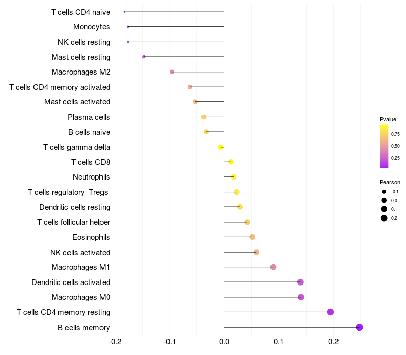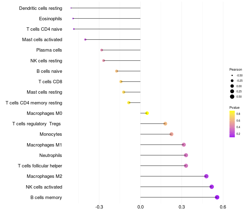 Lollipop of RICTOR expression and immune infiltrating cell level correlation result in HBV+ Liver cirrhosis samples