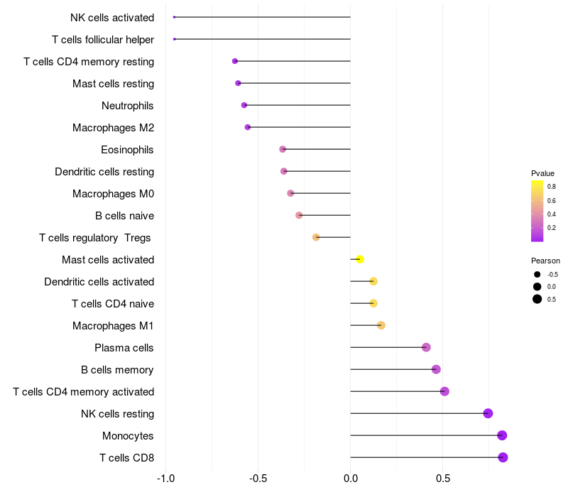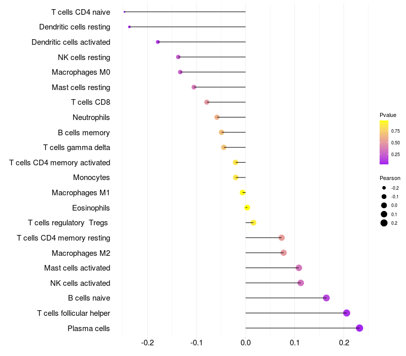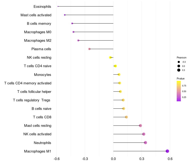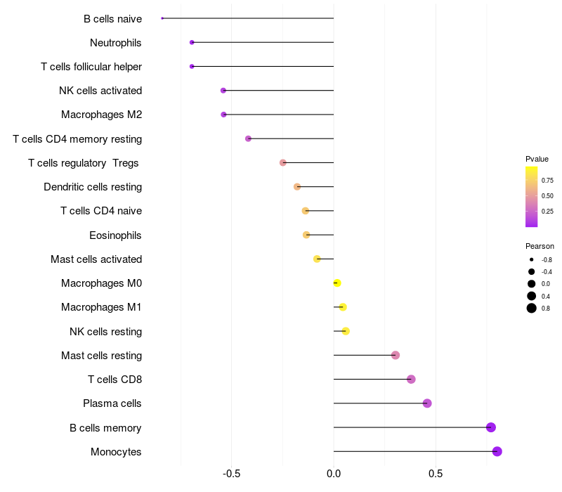 Lollipop of RIN3 expression and immune infiltrating cell level correlation result in HBV+ Liver cirrhosis samples
