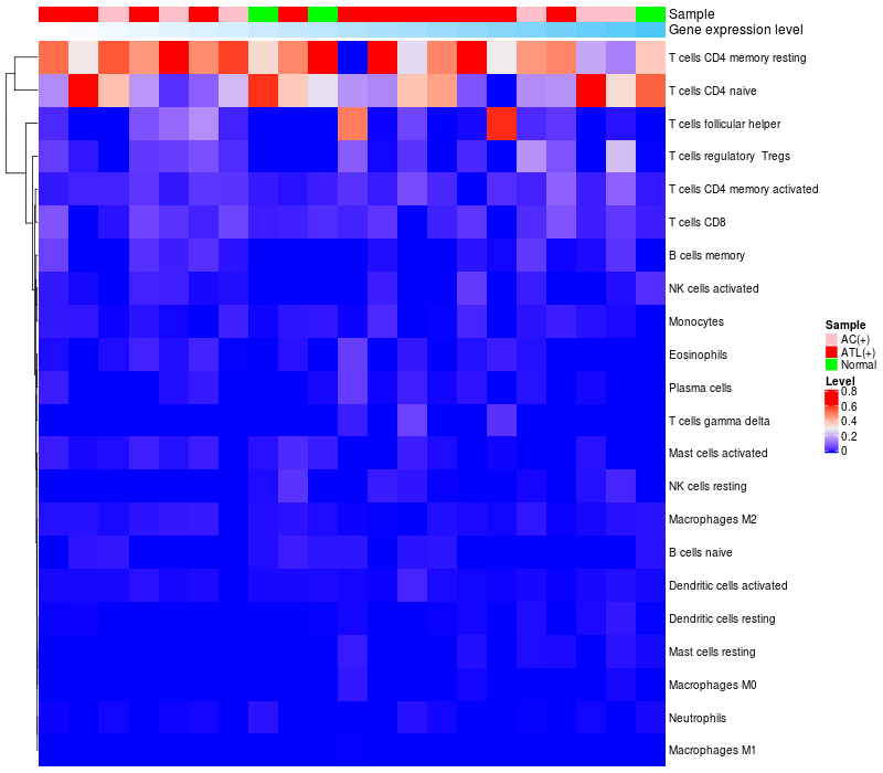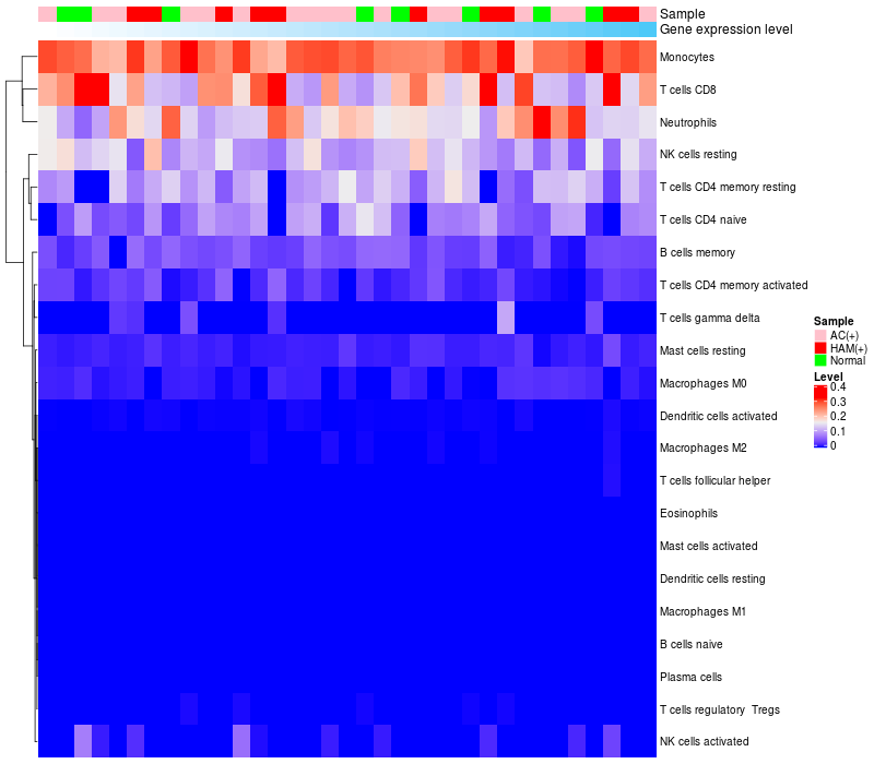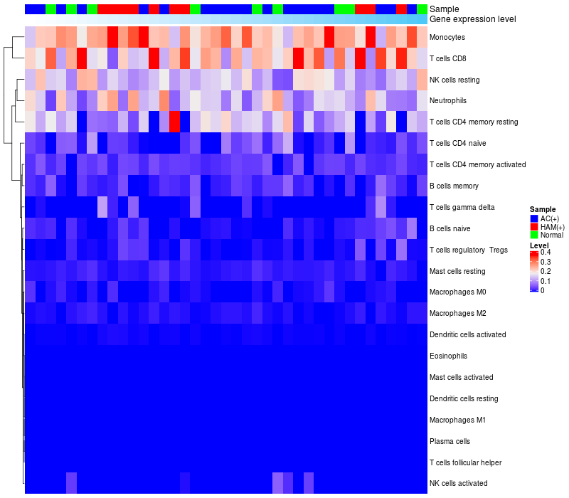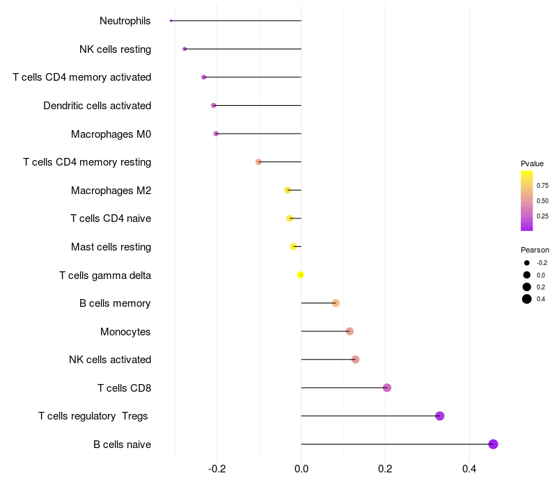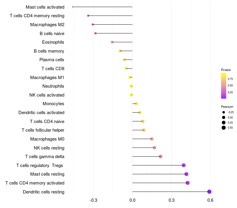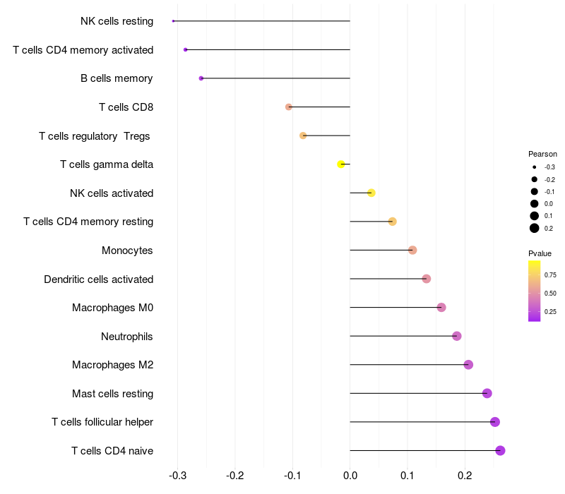 Lollipop of RNASE11 expression and immune infiltrating cell level correlation result in HTLV1+ samples
