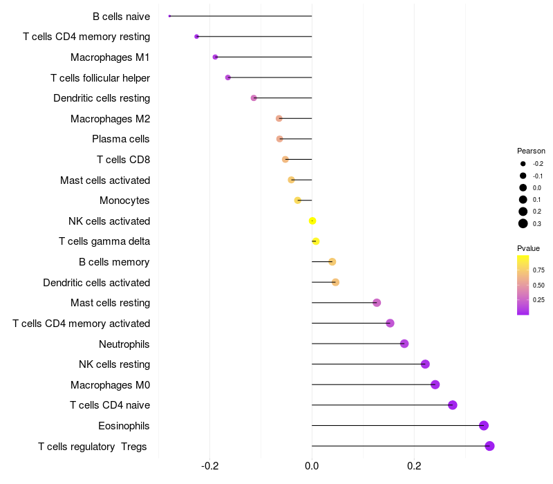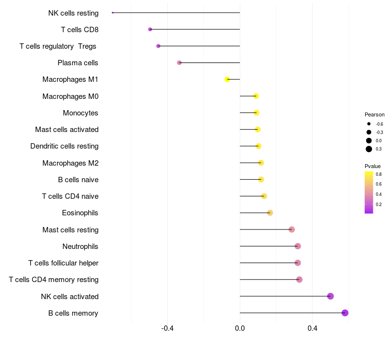 Lollipop of RNF10 expression and immune infiltrating cell level correlation result in HBV+ samples
