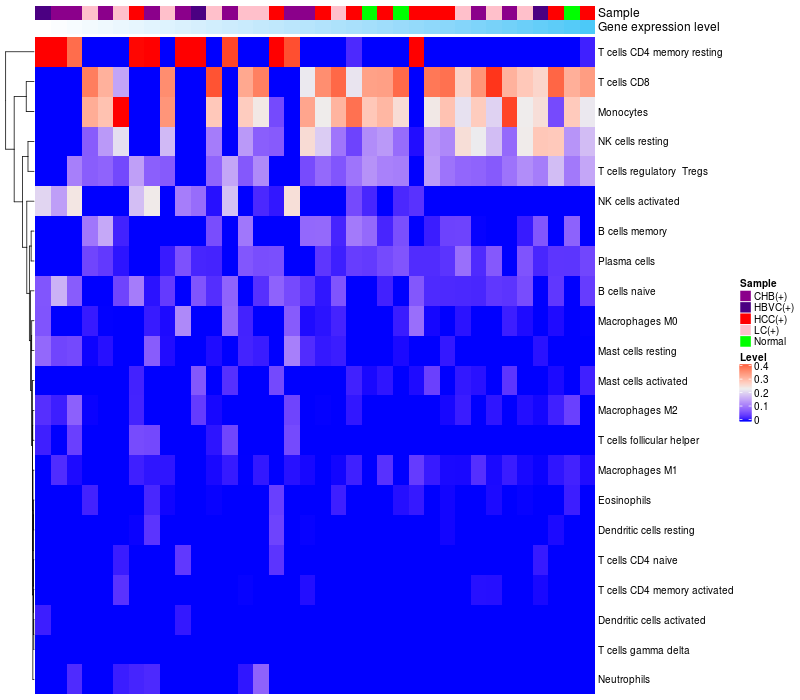 Chronic hepatitis B patients (HBV+)(10),Hepatocellular carcinoma (HBV+)(10),Liver cirrhosis(HBV+)(10),Normal(3),HBV carriers (3) |