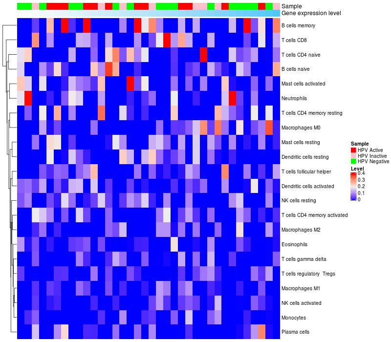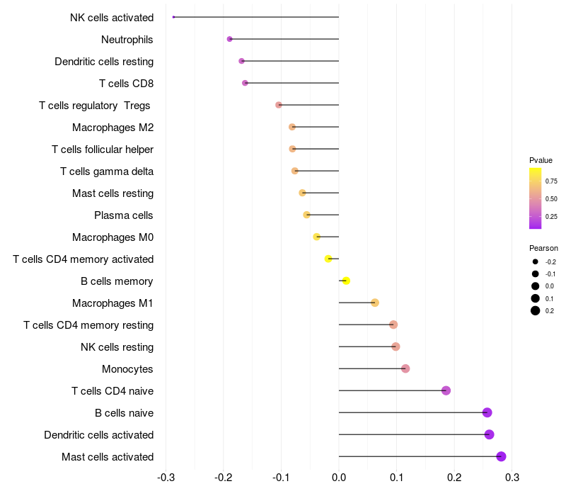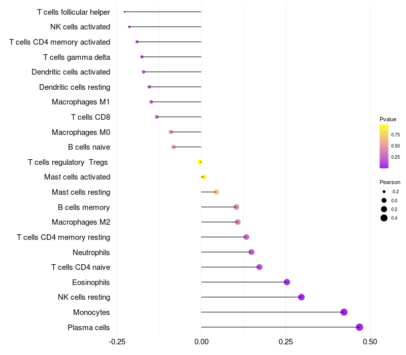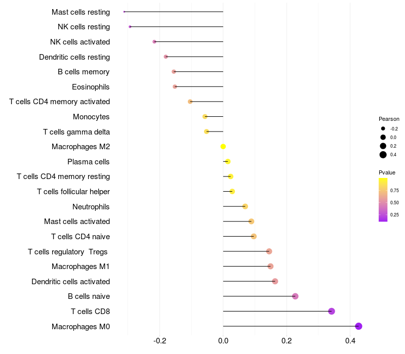 Lollipop of RNF180 expression and immune infiltrating cell level correlation result in HPV+ samples
