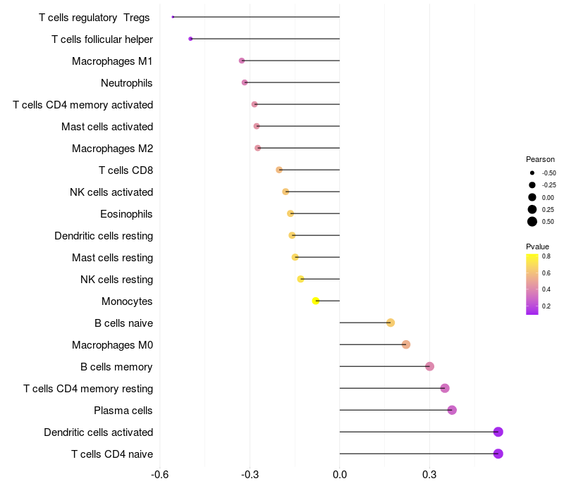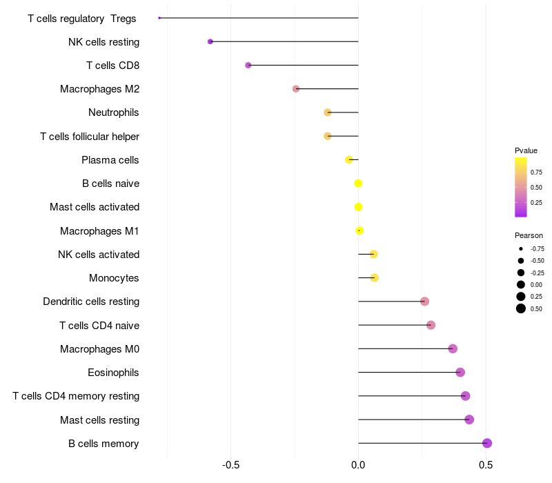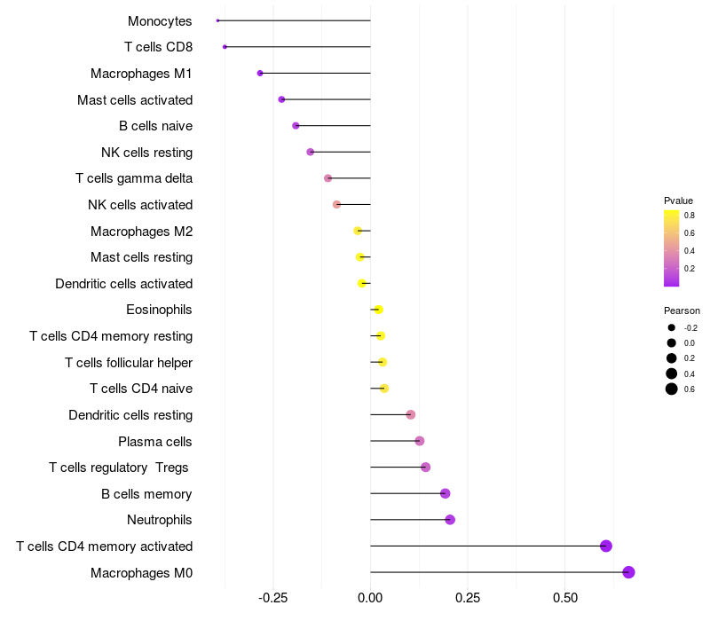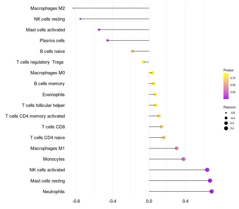 Lollipop of RNF24 expression and immune infiltrating cell level correlation result in HBV+ Liver cirrhosis samples