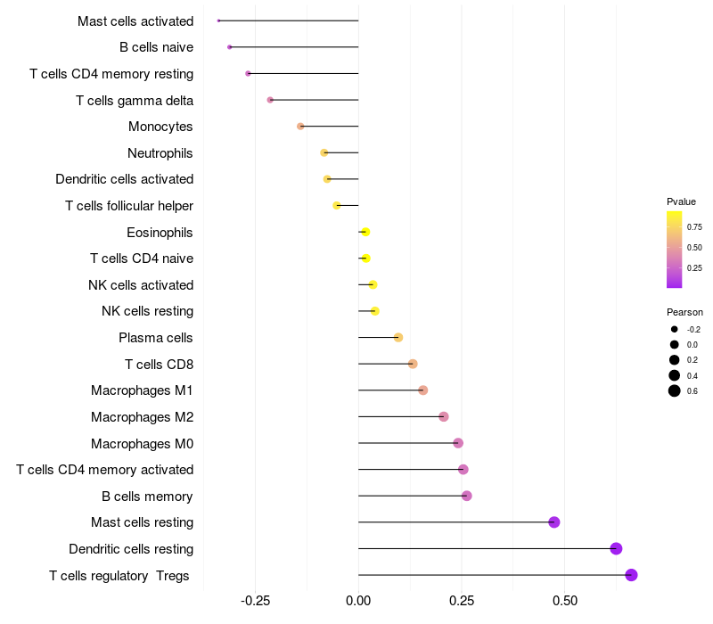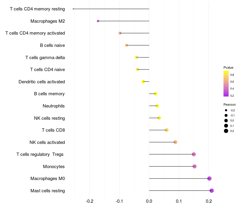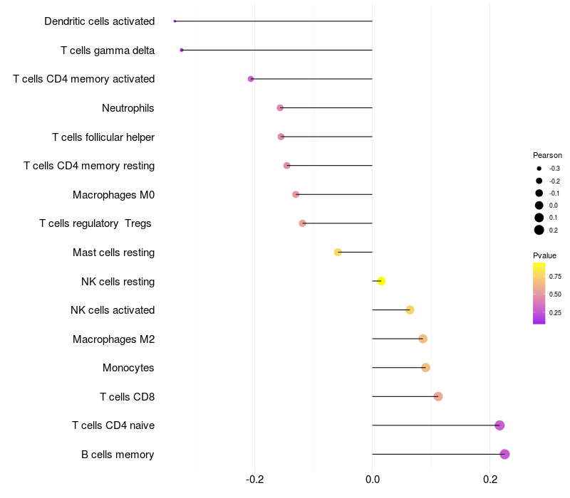 Lollipop of RNF40 expression and immune infiltrating cell level correlation result in HTLV1+ samples