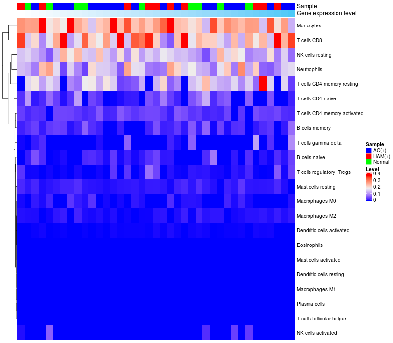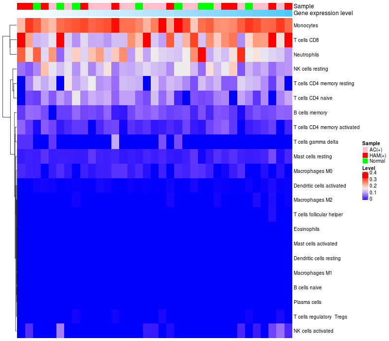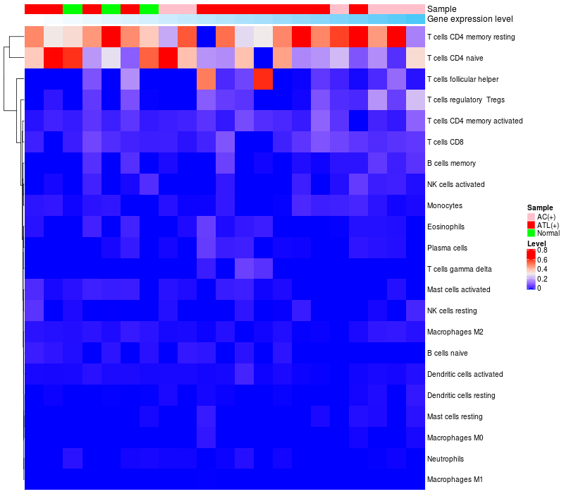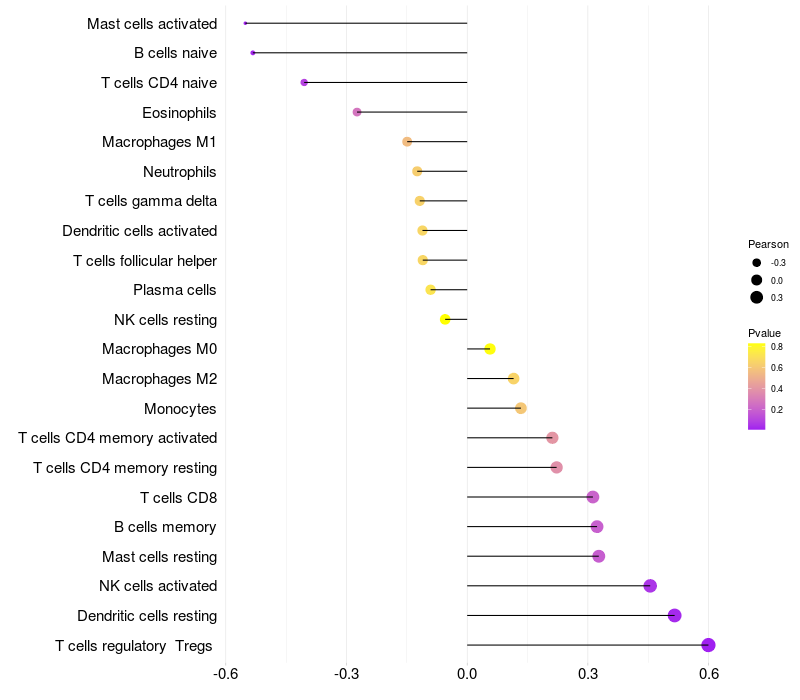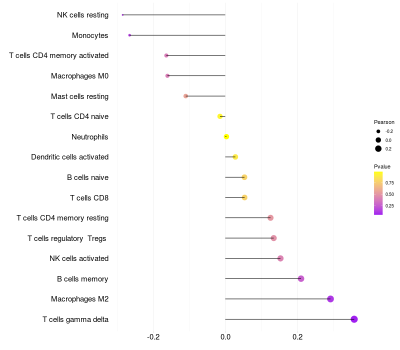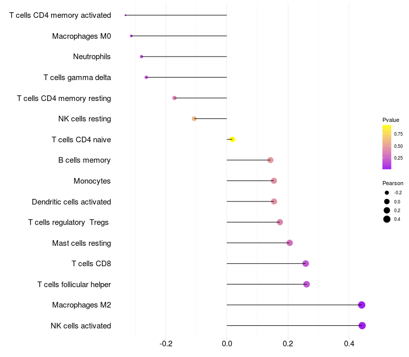 Lollipop of RNPEPL1 expression and immune infiltrating cell level correlation result in HTLV1+ samples