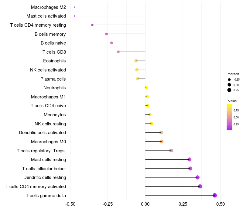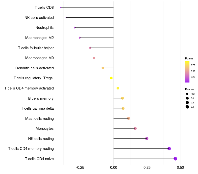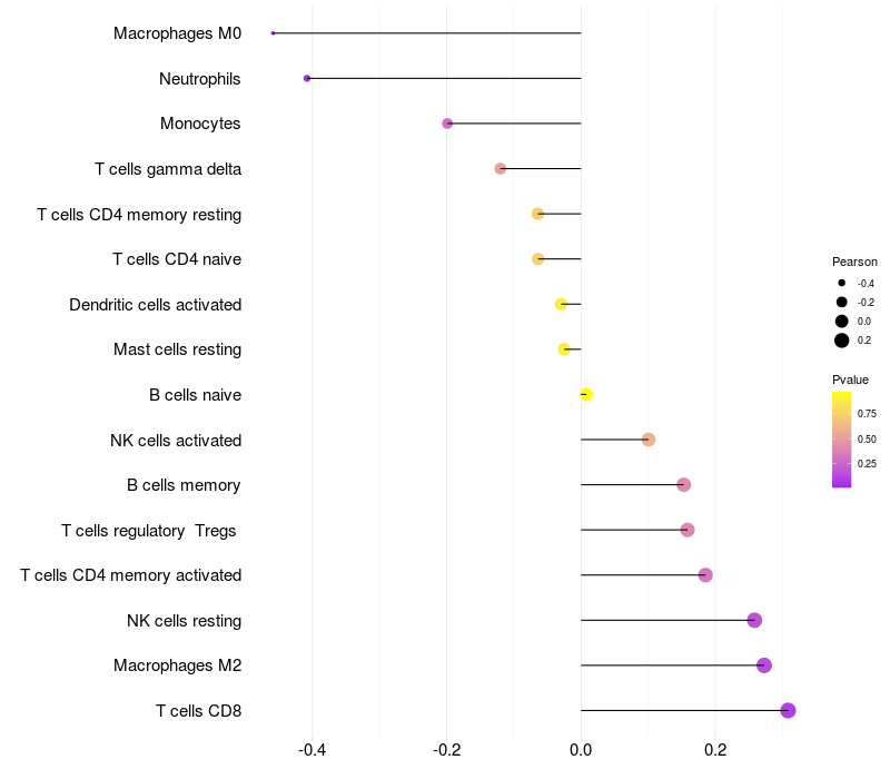 Lollipop of ROPN1 expression and immune infiltrating cell level correlation result in HTLV1+ samples