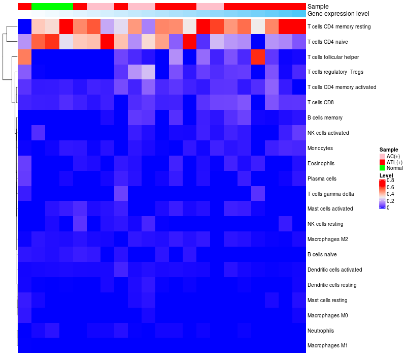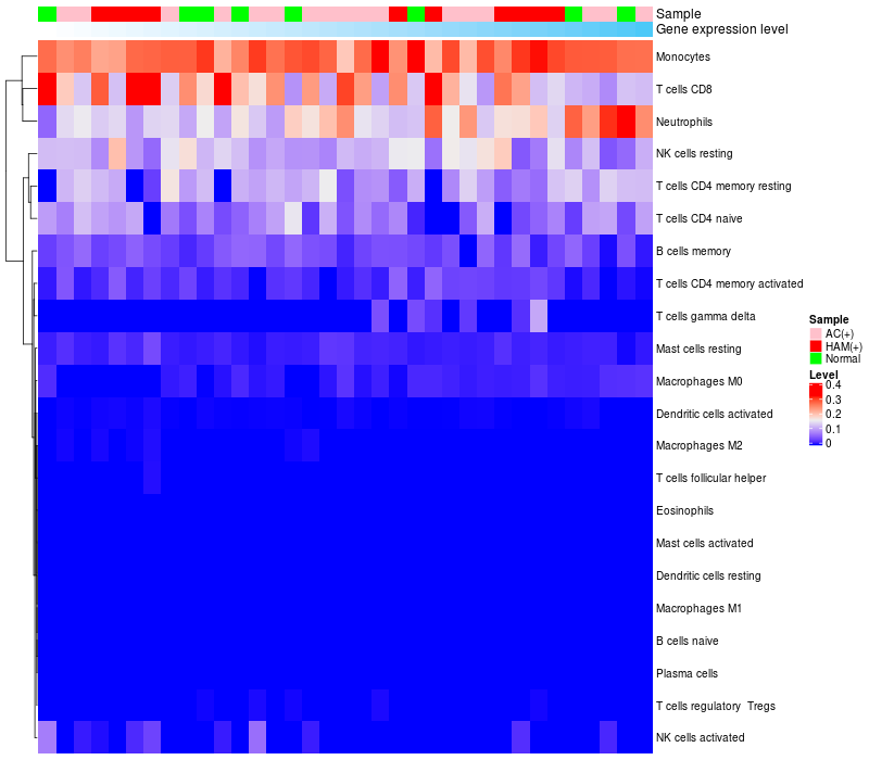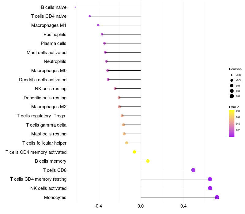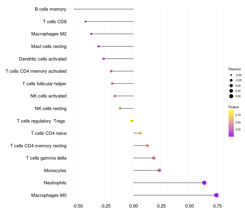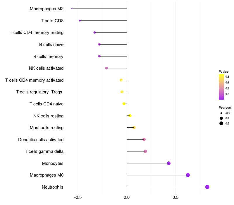 Lollipop of ROPN1L expression and immune infiltrating cell level correlation result in HTLV1+ samples
