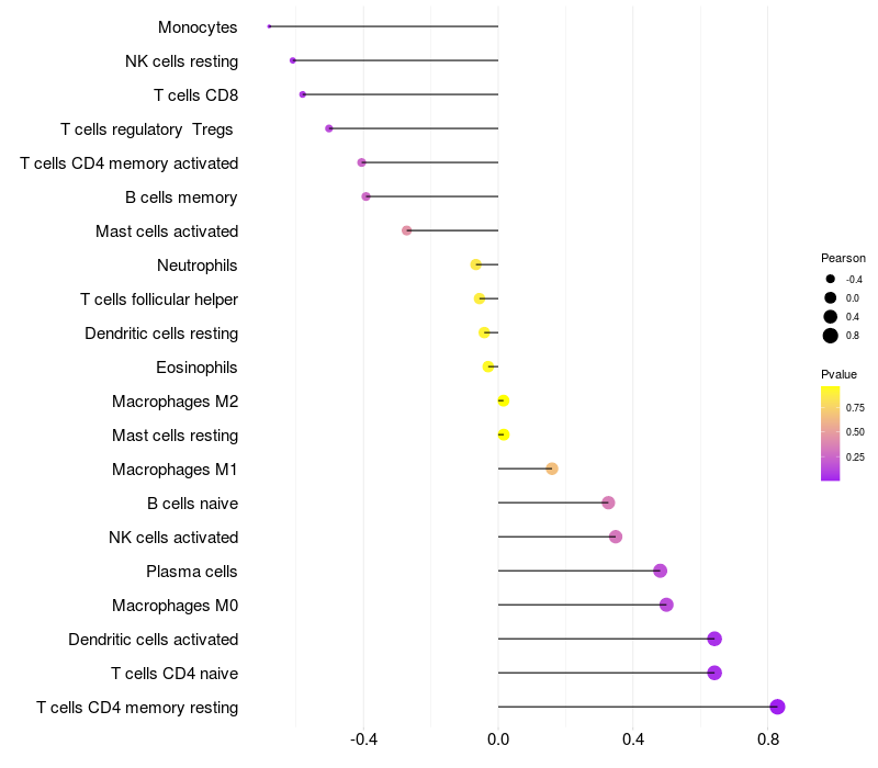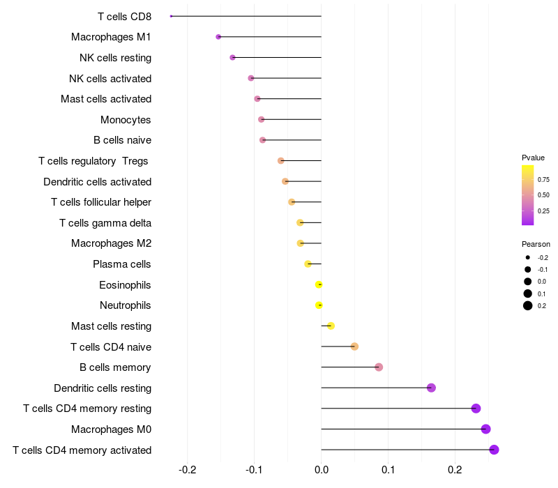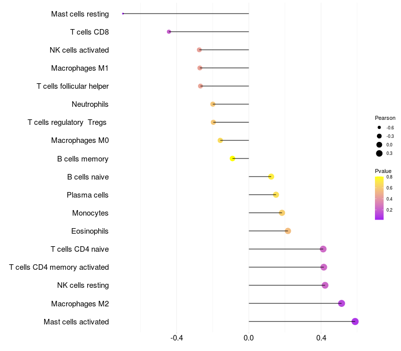 Lollipop of ROR1 expression and immune infiltrating cell level correlation result in HBV+ Liver cirrhosis samples