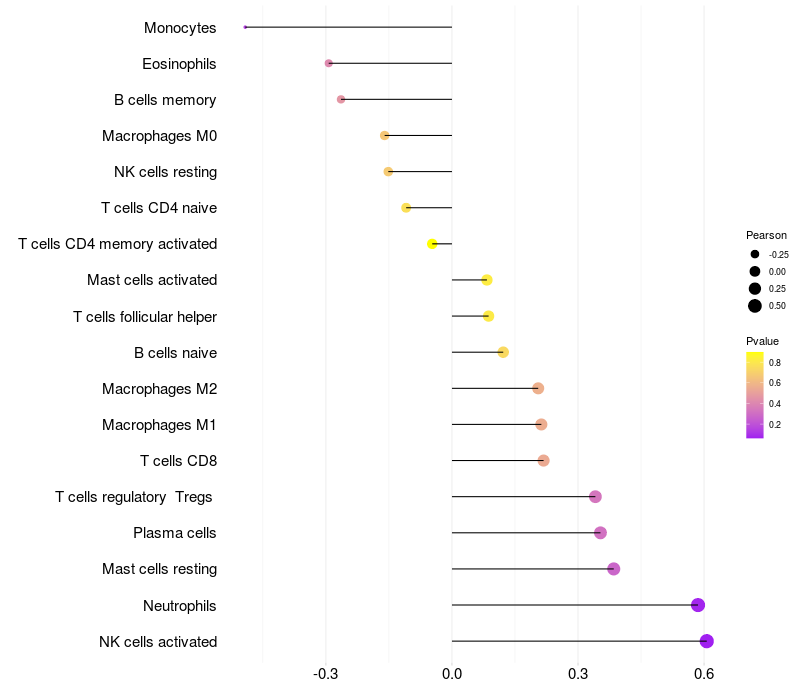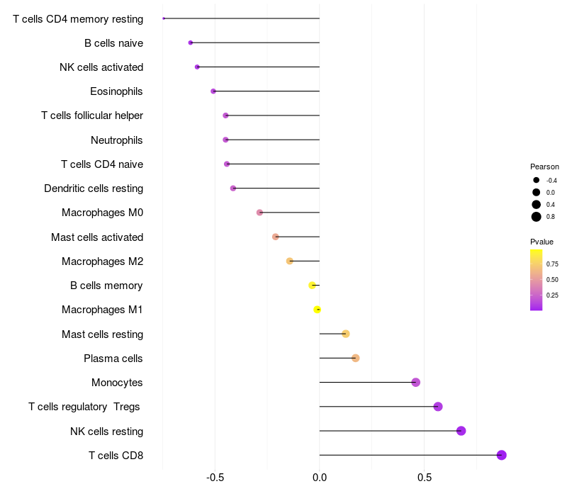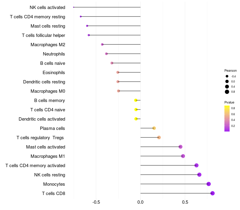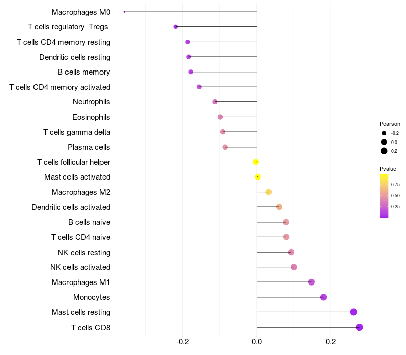 Lollipop of RORC expression and immune infiltrating cell level correlation result in HBV+ Liver cirrhosis samples