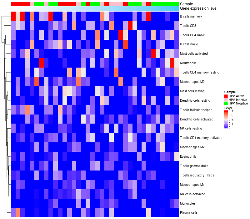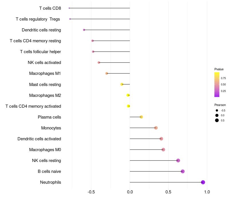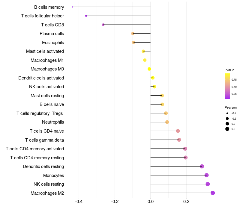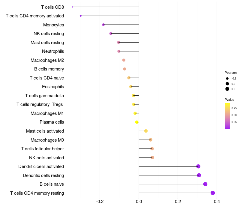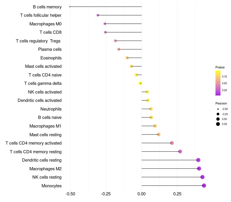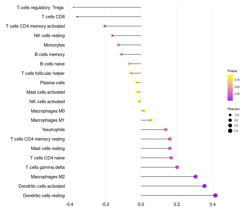 Lollipop of RPE expression and immune infiltrating cell level correlation result in HPV+ samples
