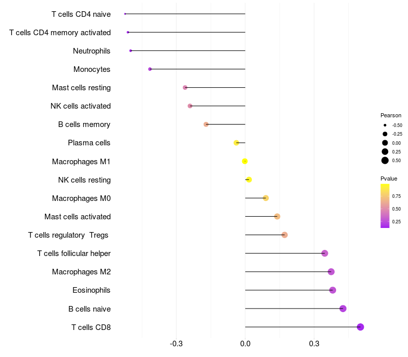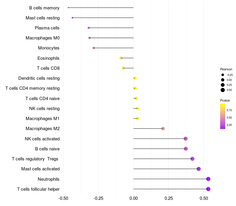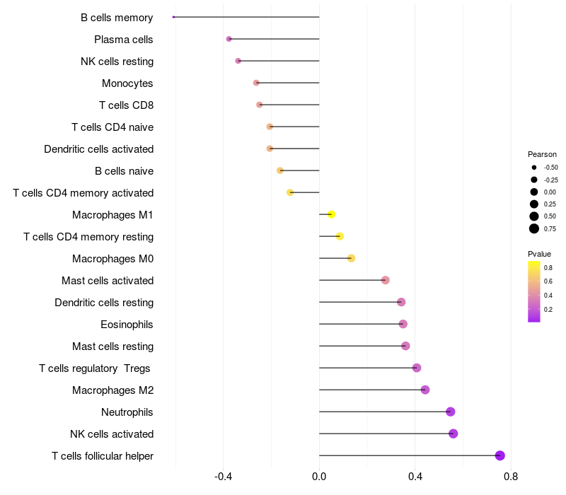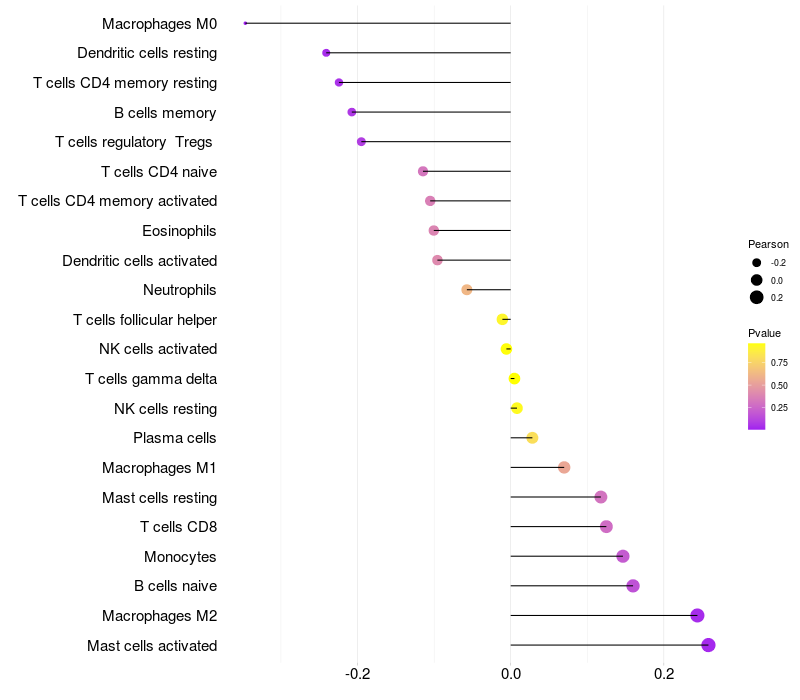 Lollipop of RPH3AL expression and immune infiltrating cell level correlation result in HBV+ Chronic HBV (CHB) infection samples