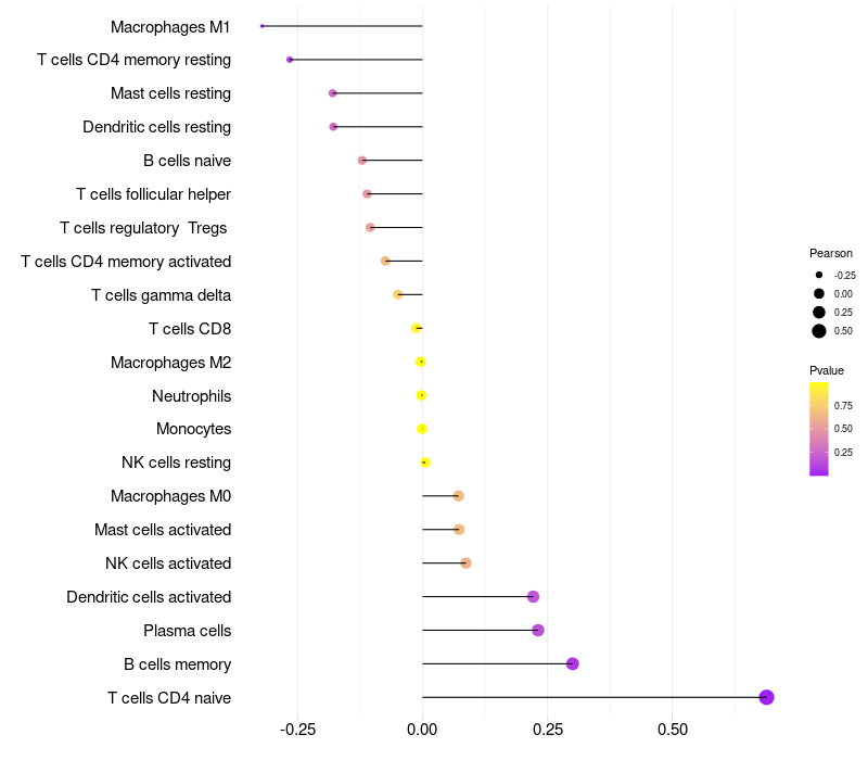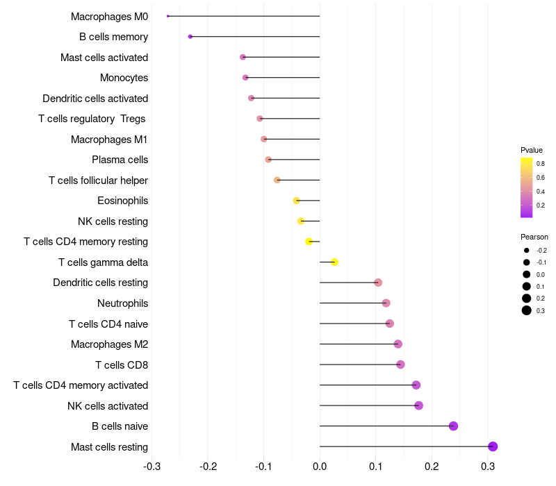 Lollipop of RPL29 expression and immune infiltrating cell level correlation result in HPV+ samples