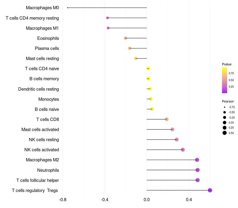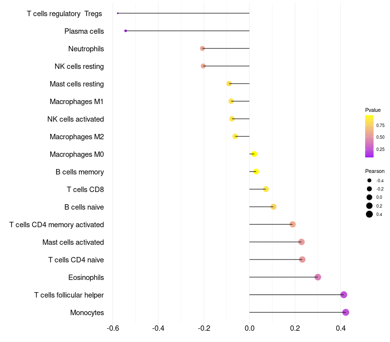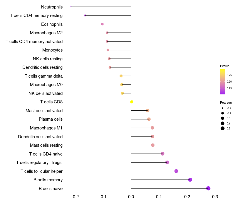 Lollipop of RPL3 expression and immune infiltrating cell level correlation result in HBV+ Liver cirrhosis samples