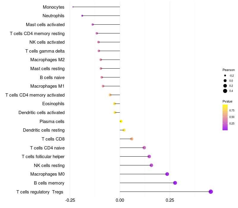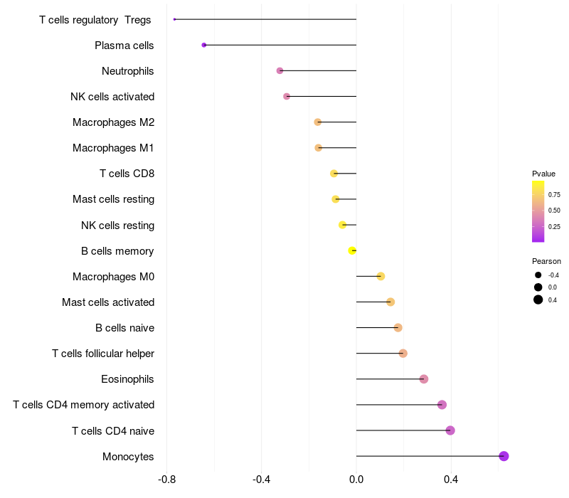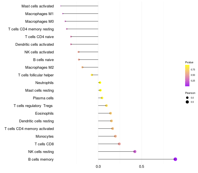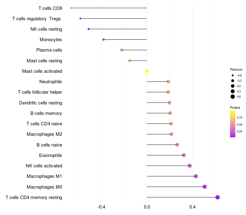 Lollipop of RPL30 expression and immune infiltrating cell level correlation result in HBV+ Liver cirrhosis samples