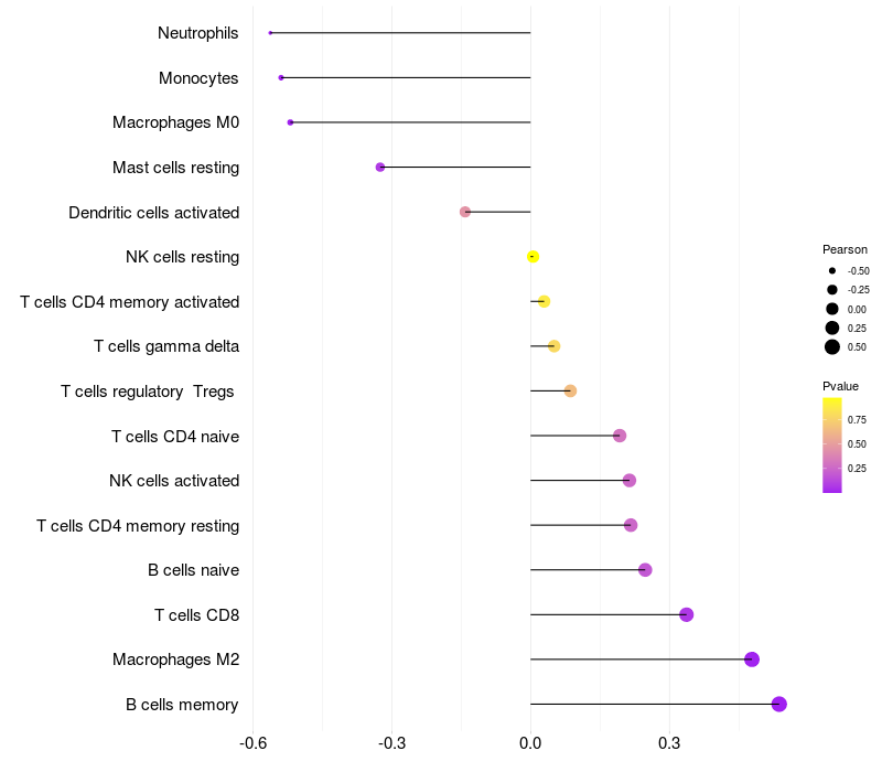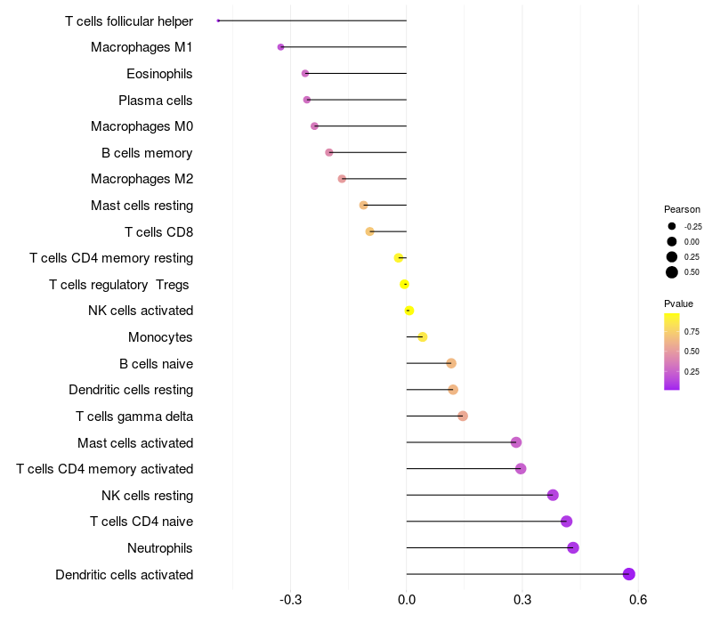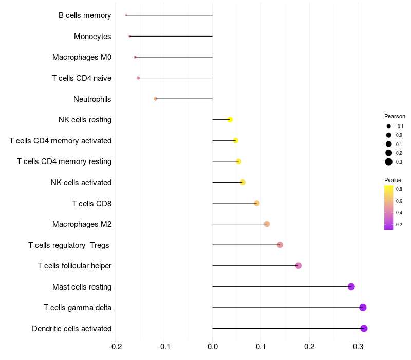 Lollipop of RPL35 expression and immune infiltrating cell level correlation result in HTLV1+ samples