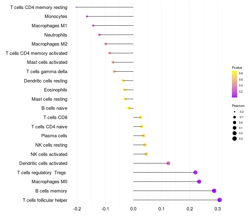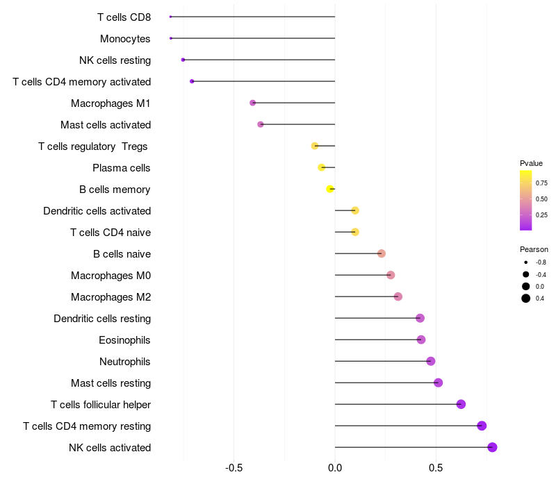 Lollipop of RPL37A expression and immune infiltrating cell level correlation result in HBV+ samples