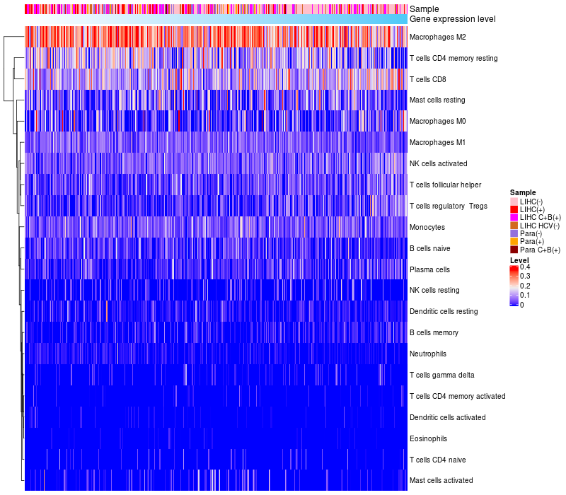 Liver hepatocellular carcinoma HCV (HBV+)(86), Liver hepatocellular carcinoma HCV (HBV-)(19), Liver hepatocellular carcinoma (HBV+)(209), Liver hepatocellular carcinoma (HBV+)(60), Paracancerous HCV (HBV+)(4), Paracancerous (HBV-)(28), Paracancerous (HBV+)(18) |