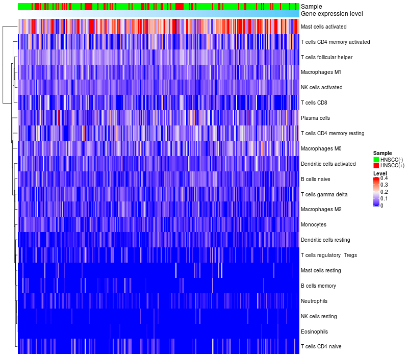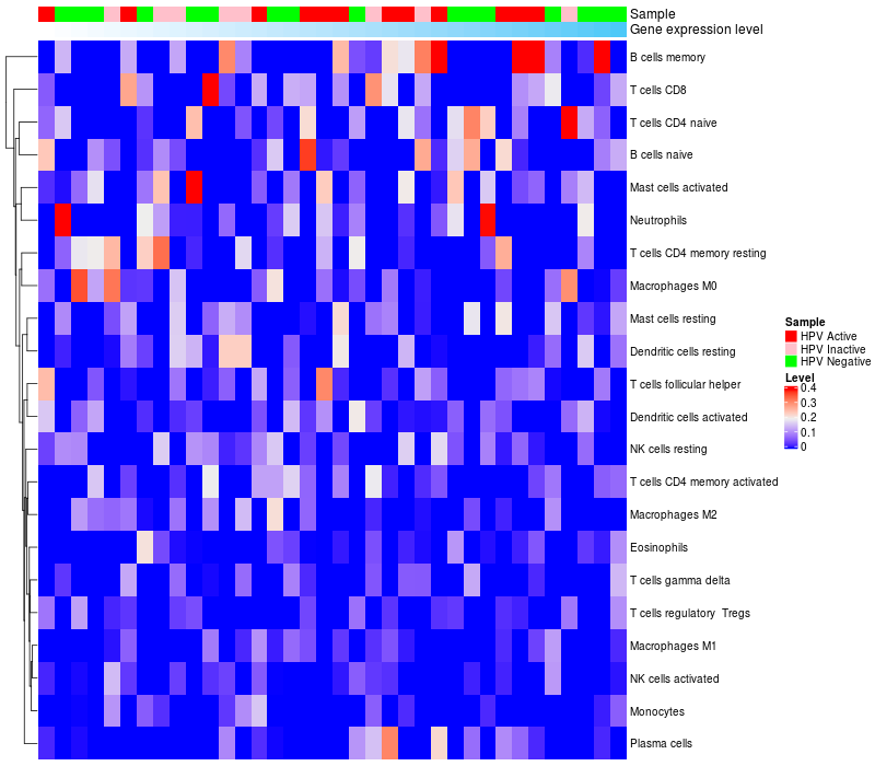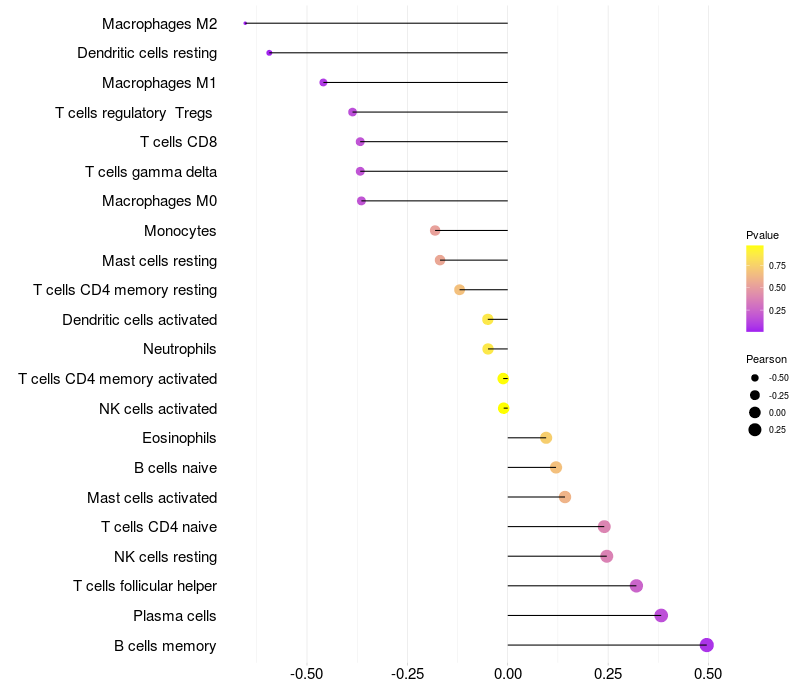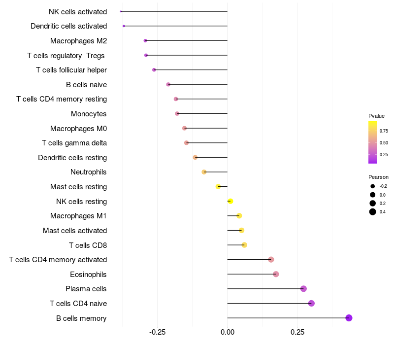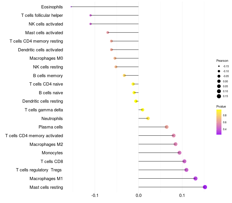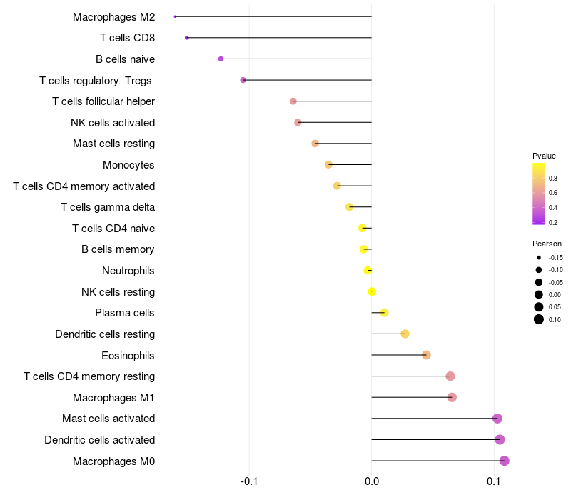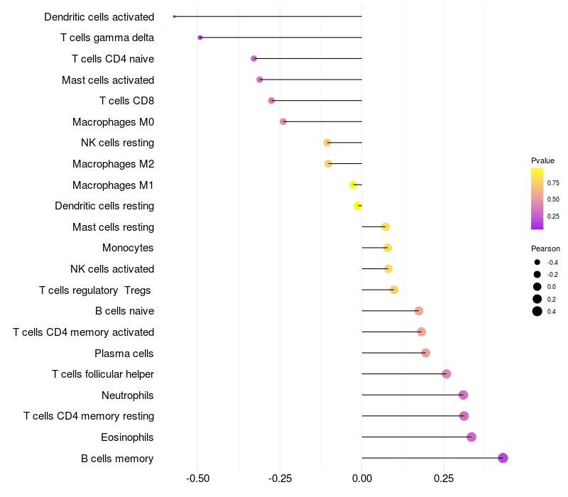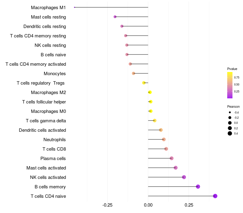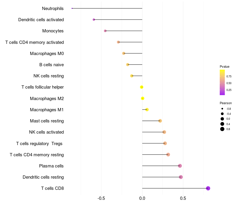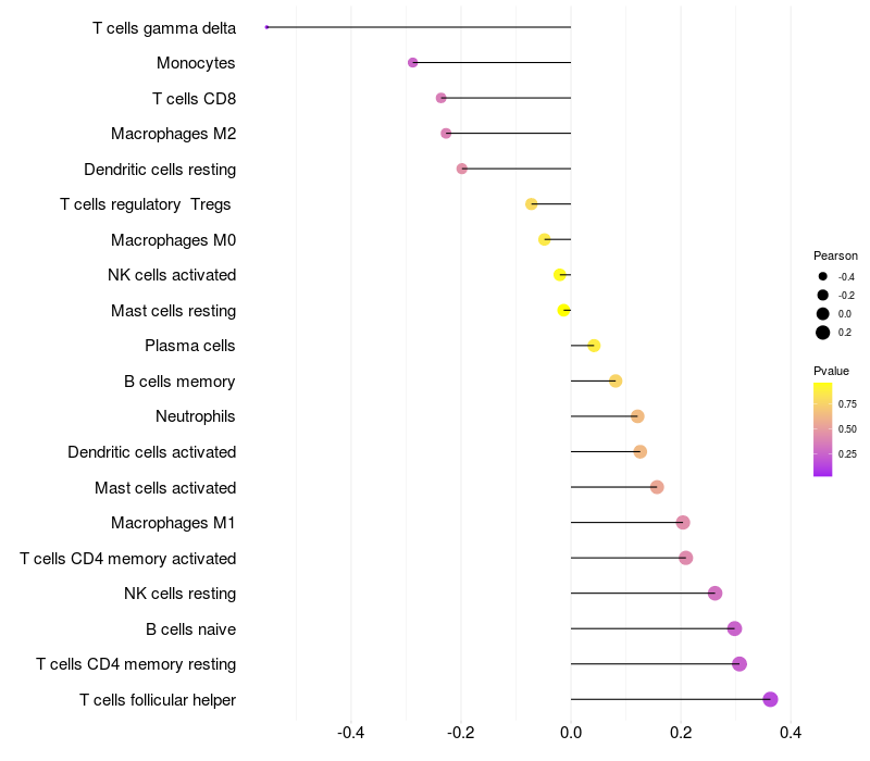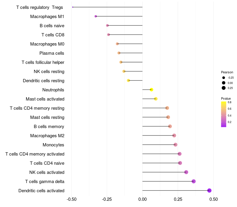 Lollipop of RPL6 expression and immune infiltrating cell level correlation result in HPV+ samples