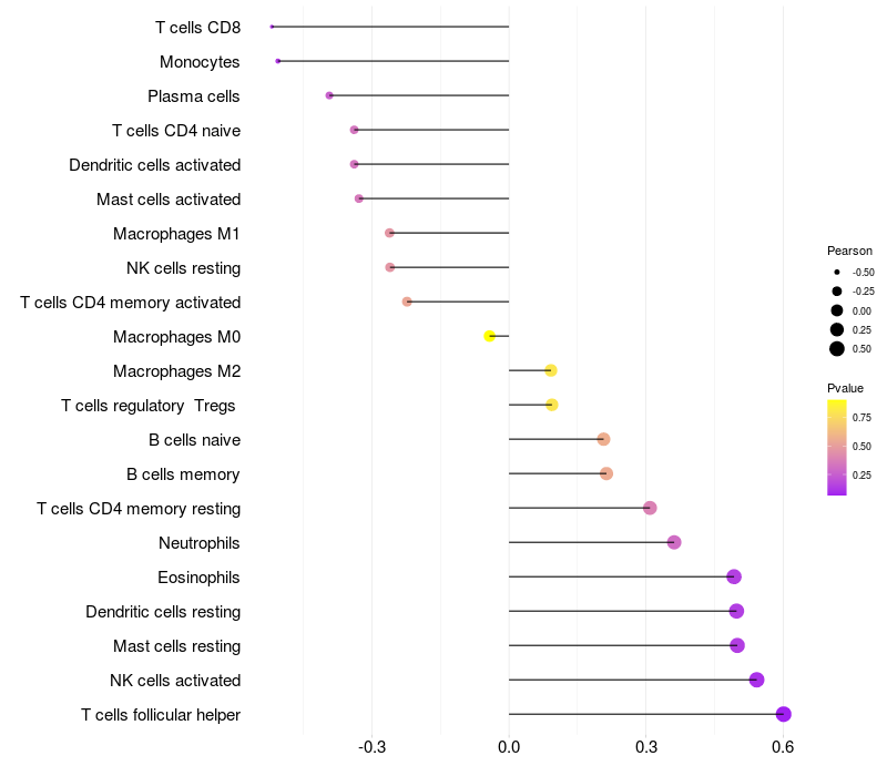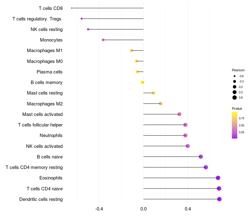 Lollipop of RPS28 expression and immune infiltrating cell level correlation result in HBV+ samples