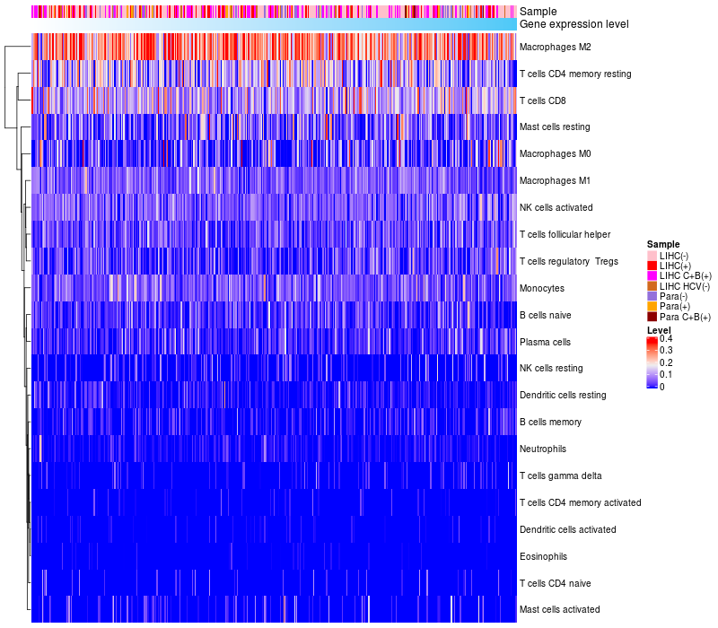 Liver hepatocellular carcinoma HCV (HBV+)(86), Liver hepatocellular carcinoma HCV (HBV-)(19), Liver hepatocellular carcinoma (HBV+)(209), Liver hepatocellular carcinoma (HBV+)(60), Paracancerous HCV (HBV+)(4), Paracancerous (HBV-)(28), Paracancerous (HBV+)(18) |